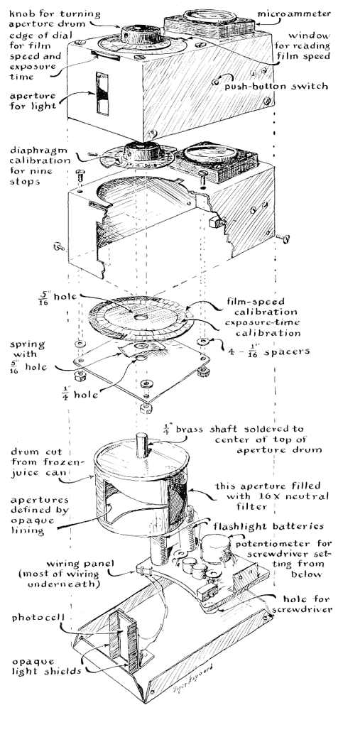 The equation for computing the radius of spherical molecules [Figure 5] is just as simple to evaluate. First, the absolute temperature is found by adding the temperature of the room in degrees centigrade to 273. The result, in the example under discussion, is 298 degrees Kelvin. The absolute temperature must then be multiplied by Boltzmann's constant (the gas constant, 8.3 X 107, divided by Avogadro's number, 6.03 X 1023): 1.38 X 10-16. The equation also includes a term for the viscosity of water, a property that varies with temperature. Reference texts list the viscosity of water at 25 degrees C. as 8.9 x 10-3 poise. Performing the arithmetic, 1.38 X 10-16 X 298 divided by 6 X 3.14 X 8.9 X 10-3 x 5.4 x 10-6 gives the quotient: 4.5 X 10-8 centimeters, or 4.5 angstrom units-a reasonable value for the average radius of the sugar molecule. It is also possible to compute the range through which diffusing molecules migrate by applying Einstein's theory of Brownian movement. The theory states that the root mean square displacement equals the square root of twice the product of the diffusion constant multiplied by the elapsed time to the observation. At the end of the first second sugar molecules will have migrated into the water a distance equal to the square root of 2 x 5.4 x 10-6, or 3.2 X 10-3 centimeters. After l80 seconds the increased distance will equal the square root of 2 X 5.4 X 10-6 X 180, or 4.4 X 10-2 centimeters. Every now and again in the course of making an experiment the need arises for exposing photographic negatives under lighting conditions that are beyond the range of inexpensive exposure meters. The problem is usually solved by the time-honored technique of cut and try. This solution served R. B. Stambaugh of Chillicothe, Ohio, well enough for several years, but after making an inventory of his scrapped negatives last summer he decided to try for a less costly method of determining exposures. The result is the transistorized exposure meter illustrated in Figure 6. "Today's high-speed photographic films and large-aperture lenses," he writes, "have made it possible to take pictures at 'available light' levels much too low for the average inexpensive light meter to handle. Sensitive exposure meters of wide range and high accuracy are commercially available-if one is willing to pay as much for them as for the camera-but they are hard to use and invite all sorts of error. "After mulling over the problem of meter design for some months I eventually hit on an apparatus for measuring light that has proved to be reliable, adaptable to extreme ranges of measurement and inexpensive to build. The device consists essentially of a photosensitive cell, enclosed in a drum that has slot of variable width to admit light, and a meter for indicating amplified cell current. Turning the drum shifts the position of the variable slot and admits more or less light to the cell. The drum is adjusted until the meter indicates a predetermined value of current. At this adjustment the cell always 'sees' the same amount of light and the meter always indicates the same value of current, regardless of the intensity of the external light. "Adequate sensitivity is provided by a two-transistor amplifier arranged in a balanced bridge circuit, as shown in the accompanying diagram [Figure 7]. The bridge circuit reduces the effects of temperature and change in voltage as the batteries age. The null balance principle of always reading a predetermined value of current eliminates the effect of nonlinearity in the response of the photocell to light and nonuniform amplification by the transistors. "The entire assembly, including the miniaturized amplifier, drum and photocell, is housed in a box of sheet aluminum that is four inches long, three inches wide and two inches high. "The slot in the drum is made by cutting a mask from a strip of opaque cardboard that fits smoothly around the juice-can drum. Ten areas are marked off on the strip. The width of each rectangular area is determined from the size of the aperture drum and the markings of the f-number dial. In my instrument, the dial covers nine f numbers in a 180-degree turn, or 20 degrees per f number. Twenty degrees corresponds to .37 inch on my drum, which is 2 1/8 inches in diameter. One cannot easily hand-cut a slot much narrower than about 1/16 inch with the required precision. So I joined two tapered slots end to end and covered the second one with a 16X filter made from exposed film. This stunt enabled me to increase the width of the last five rectangles 16-fold. It is not necessary to cut the slots as a series sharp steps; one needs only to draw a curve that connects the midpoints of the rectangles as shown in the accompanying illustration [Figure 8]. "The filter of desired density was made by taking 16 'pictures' of a blank wall while gradually increasing the exposure. A hole with an area one-sixteenth as large as the sensitive area of my selenium cell was then cut in a piece of opaque paper and used to mask the cell. The masked cell, connected to a microammeter, was exposed to the lamp of my enlarger at a distance such that the pointer of the meter was deflected to half-scale. The paper mask was then replaced by the film. The film was shifted until an area was found that deflected the meter to half-scale. This area was selected as the 16X filter. "After assembly the meter was calibrated against a good commercial exposure meter by turning the knob until the microammeter read half-scale (25 microamperes) while both instruments were pointed toward a flat-lighted piece of white cardboard. The correct shutter speed, f number and film speed indicated by the commercial meter were transferred to the homemade meter by loosening the setscrew of the dial and, without disturbing the position of the aperture drum, rotating the dial until the f-number scale was opposite the proper shutter speed. When the setscrew in the knob was tightened, the meter was calibrated fo