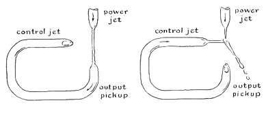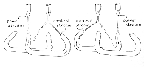 "While experimenting with the oscillator-amplifier circuit in an attempt to make a hydraulic motor control itself, I hit on a bi-stable circuit, an analogue of the electronic 'flip-flop.' In one of the two stable states a power jet drives a control jet that deflects a second power jet against a shield, as shown at the left in the accompanying illustration [Figure 3]. An output jet connected to the control circuit of the first power jet delivers output, in the form of a miniature fountain, as long as the circuit remains in this state. If you interrupt the first power jet, for instance by sticking your finger momentarily into the stream, the circuit flips to its alternate stable state. The second power jet deflects the first power jet from the control circuit. Interrupting the second power jet returns the circuit to its initial stable state. The switching intervals are approximately equal, although the circuit is asymmetrical.