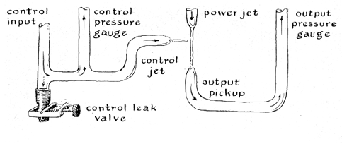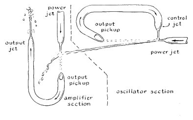 "The operation of a pure fluid oscillator is much easier to grasp than its electronic analogue. Water entering the power nozzle under pressure and flowing from it as a jet is received by the output nozzle and fed back through circuit tubing to the control nozzle. The resulting jet from the control nozzle momentarily deflects the power jet away from the output nozzle. The action is not instantaneous. Initially the control circuit is empty and a little time is needed for it to fill up. Even a full control tubing contains a few bubbles of air that must be compressed before the jet forms. The springiness of the bubbles corresponds to capacitance in the electrical analogue. In addition, the column of water in the control circuit has mass and is therefore characterized by inertia. The column cannot be instantaneously accelerated from rest to maximum velocity. The inertia corresponds to electrical inductance. As a result the power jet flows into the output jet for a finite interval and is then diverted for another finite interval, depending partly on the momentum of the control stream and partly on the energy stored in the compressed bubbles. The cycle is then repeated. The output consists of a series of unidirectional pulses, as does the output of a triode oscillator. I have not attempted to couple the oscillator to a 'tank' circuit for converting the unidirectional pulses into alternating flow. Such a tank might consist of a U-shaped tube. The output of the pure fluid oscillator would be fed into one arm of the U. Periodic pulses of incoming water would make water standing in the U tube oscillate at a frequency determined by the 'inductance' represented by the mass of the water column and the 'capacitance,' in this case represented by the force of gravity.