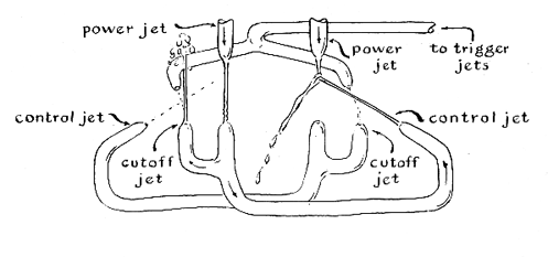 "Both versions of the flip-flop were triggered, or flipped, by interrupting the power jet by hand. Electronic counterparts use a triggering circuit. My next series of experiments was aimed at developing a pure fluid analogue of the electronic trigger circuit. The problem appeared to be rather simple at first: a pair of triggering nozzles powered from a common source would be positioned so that jets of short duration could divert either the control jets or the power jets. The first triggering pulse would 'flip' the circuit for conduction by one stage; the following pulse would 'flop' conduction to the alternate stage. I decided to trigger the control jets. Experiment quickly showed that the problem was not so simple. At certain times the circuit flipped and at other times it remained in the initial state, depending on the duration of the triggering pulse. A sufficiently short pulse triggered a change in state every time. A long pulse would in effect trigger both the flip and the flop, because the twin jets of the trigger could divert either or both of the control jets. Positive action was provided by a second pair of jets located between the triggering jets and their corresponding control jets. These can be thought of as cutoff jets. Their location is shown in the accompanying illustration [Figure 5]. The cutoff jets block the triggering pulse on the conducting side and prevent its twin from hampering the action of the 'off' control jet. Observe that the output pickup nozzles, the control and cutoff nozzles are located on a common level to prevent the circuits from draining in the flipping interval.