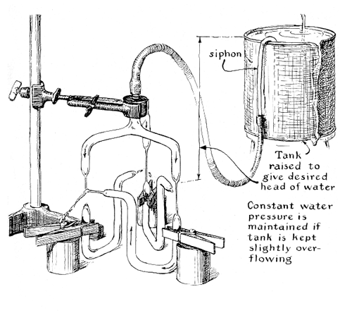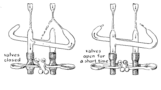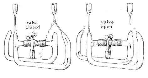 "When these experiments were first undertaken, I spent a lot of time trying to design completely enclosed systems. It seemed obvious that a jet of water could not possibly enter a facing nozzle without excessive splashing, particularly if it had to work against a head of pressure in the facing nozzle. One day I directed a small stream from one eyedropper nozzle into another nozzle about two inches away. The diameters of the nozzles were about equal. To my surprise the arrangement worked about as efficiently as a closed system. When the stream is laminar, the jet narrows somewhat as it comes from a nozzle. Hence it readily enters an opening with the same diameter as that of the exit nozzle. On entering the second nozzle the jet is capable of building up a head of pressure because of its momentum. The disadvantage of using a receiving nozzle with a diameter smaller than that of the exit nozzle is obvious. On the other hand, pressure will not develop in a receiving nozzle so large that the jet simply splashes off the inner wall and runs out.