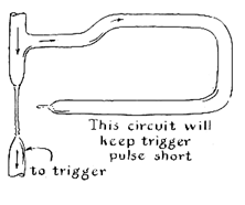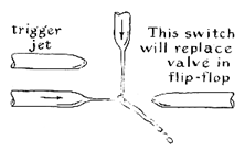 "While examining electronic circuits closely I concluded that triggering involves a negative pulse: taking energy away from the circuit rather than adding it. With this in mind I returned to the symmetrical bi-stable circuit and equipped the control feedbacks with drains in the form of pinchcocks placed so that they can be opened simultaneously, as shown in the accompanying illustration [Figure 7]. Operating the pinchcocks reduces the pressure of the conducting control jet but has no effect on the nonconducting branch. (Incidentally, it will be observed that when conduction is initiated in a circuit, the first pulse from a nozzle is much more forceful than that of the steady stream. The effect is explained by the momentum gathered by the water as it rushes through an empty tube; it is analogous to inductive effects in electronic circuits that generate pulses of high voltage, such as 'kick' coils and induction coils.) The initial circuit operated well enough to demonstrate that I was on the right track. The device is highly sensitive to input pressure at the power jets, however, and tended to go into uncontrolled oscillation rather than to flip. "A variation of the arrangement resulted in my most effective flip-flop. Two feedback drains are coupled through a single-trigger valve, or pinchcock [Figure 8]. Opening the valve greatly decreases pressure at the presently conducting control jet, and the water drains into the presently nonconducting control jet. The 'off' power stream thereupon activates the 'off' control jet, completing the flip. The second operation of the valve returns the circuit to its initial state. Actually, even when the valve is opened momentarily, the circuit oscillates for a half-cycle. This constitutes the 'flip.' The circuit has one disadvantage: it is sensitive to variations in power pressure and tends to go into uncontrolled oscillation. The mechanical valve can be replaced by a pure fluid switch. One version is shown in the accompanying illustration [Figure 9]. Unwanted oscillation can be prevented by using triggering pulses of short duration. A circuit for generating short pulses automatically is assembled by coupling a cutoff nozzle to the triggering nozzle through a short length of feedback tubing [Figure 10].