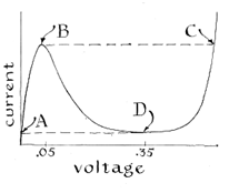 "Like all rectifying devices, including check valves in water pipes, tunnel diodes conduct differently in different directions. They exhibit their most interesting property when conducting in the forward direction. A small voltage must of course be present to induce current in the forward direction, just as some pressure must be applied to force water through a check valve. In a typical tunnel diode the current increases as the applied potential is increased from zero up to .05 volt. As the voltage is increased from .05 volt to .35 volt, however, an astonishing effect is observed: the current decreases! Conversely, as the voltage is lowered through this range, the current increases, an effect that one would expect only if the circuit contained a generator or other source of electrical energy. "Esaki explained this phenomenon in terms of the tunnel effect, a theoretical concept introduced to describe the behavior of an electron that does not have enough kinetic energy to penetrate an electric field but nonetheless manages to 'tunnel' through the barrier. The potential barrier is imagined as a hill and the electron as a wave that extends through the hill but decreases sharply in amplitude. The resulting shape of the wave is interpreted as meaning that the electron gets through the hill without having been pushed over it. The effect of positive and negative resistances associated with tunnel diodes is shown by the accompanying graph [Figure 1], in which increasing current is plotted upward on the vertical co-ordinate and increasing voltage from left to right on the horizontal co-ordinate. Observe that as the voltage increases from zero the current rises to point B, as one expects of ordinary circuits. From .05 volt to .35 volt, however, the current drops to D, in apparent defiance of Ohm's law. Beyond .35 volt the current again increases with increased voltage.