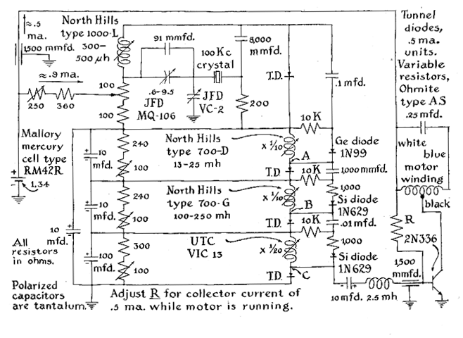 "The frequency at which a tunnel diode oscillates this circuit is determined by the resistance of the total circuit, the included inductance and the magnitude of the battery voltage. The trick in applying tunnel diodes as oscillators consists mostly of connecting a resonant circuit of the desired frequency to the diode and suppressing the influence of those parts of the circuit that resonate at unwanted frequencies. The components used in the chronometer, their physical placement on the chassis with respect to one another and the shielding that surrounds them were all selected to accomplish this objective. "The circuit of the chronometer consists of three sections: the crystal oscillator, frequency dividers and the power amplifier, together with its associated motor. The components are appropriate for use with either a 100-kilocycle or a 120-kilocycle quartz crystal, except that each crystal requires a minor change in the oscillator circuit. Moreover, a 50cycle motor must be used with the 100-kilocycle crystal and a 60-cycle motor with the 120-kilocycle crystal. "A sheet-metal chassis some six inches square and two inches high accommodates all wiring and circuit components. I combined two units measuring 6 1/2 by 3 1/8 by 1 1/2 inches, but a single one of adequate size that provides complete shielding from external electrical disturbances will suffice. Power for driving the motor is provided by a transistor amplifier that is mounted on the terminal board of the motor. The accompanying circuit diagram and photograph show the wiring and the physical arrangement of the parts [see Figures 4 and 5]. "The accuracy of the chronometer depends on the performance of the quartz crystal. For maximum frequency stability the crystal should not be subjected to wide variations in temperature. Preferably one should use a vacuum-mounted GT-cut quartz crystal that has been aged, such as those manufactured by the Northern Engineering Laboratories of Burlington, Wis. Vacuum-mounted DT cut crystals are less expensive and may be substituted. When using a suitable DT-cut crystal, one can expect a frequency change of about one part per million for a 10-degree-centigrade temperature change. Other electrical properties of quartz crystals, such as the equivalent series-resonant resistance, are important in this application; this article should therefore be mentioned when the reader is ordering a crystal for use in the chronometer. "The schematic diagram shows one small fixed capacitor and two small variable capacitors connected to one side of the crystal, a total of 110 micromicrofarads that can be increased or decreased through a range of about five micromicrofarads in either direction. The combination serves as the load capacitor and is appropriate for a GT-cut crystal. For a DT-cut the five-micromicrofarad range is inadequate. It can be increased by substituting a trimmer capacitor of wider range such as a JFD VC-28G. If this expedient proves to be inadequate, small fixed capacitors can be added as required. Small changes in the frequency of the crystal are made by altering the setting of the trimmer capacitors. They serve as the fast-slow adjustment of the chronometer.