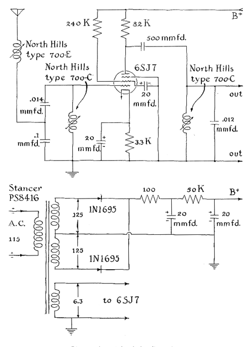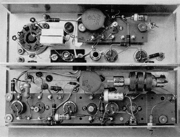 "Vary the helipot and note the current range through which the correct frequency ratios obtain. The sequence of adjustments of the inductors and the 100-ohm resistors should be repeated until the current range for proper operation of the last two counters is a maximum. Record the current range (.85 to one milliampere) as well as the current required for the 50 per cent duty cycle (.95 milliampere). This information is essential for making subsequent adjustments. "Next, disconnect the 1.5-volt dry cell and reset the helipot to maximum resistance. Remove the clip lead that was across the oscillator tunnel diode and connect it between the ground and the junction of the 100-ohm and 200-ohm fixed resistors in the oscillator circuit. This short-circuits all the divider circuits. Set the 300-to-500 microhenry inductor at minimum inductance. Connect the oscilloscope between the ground and the junction between the oscillator tunnel diode and the 8,000-micromicrofarad capacitor. Reconnect the battery and adjust the helipot and the 100-ohm control in the oscillator circuit so that the oscillator is running and draws the same current (.95 milliampere) as was recorded for the 50 per cent duty cycle. Again vary the helipot and note the current range for oscillation. This should easily bracket the divider-current range (.85 to one milliampere). "Disconnect the dry cell, remove the clip lead and connect a high-impedance voltmeter across the battery input terminals. Reconnect the 1.5-volt dry cell and adjust the helipot and the 250-ohm variable resistor so that voltage at the battery input terminals is 1.35 volts and the current is that corresponding to a 50 per cent duty cycle (.95 milliampere) in the dividers. Make sure that the crystal oscillator is operating. The three divider inductors should be trimmed to maintain the proper division ratios while the input voltage is decreased by increasing the resistance of the helipot. Now adjust the 250-ohm resistor and the helipot so that the input voltage indicated is again 1.35 volts but the current is larger (although somewhat less than the maximum for proper operation). Connect the 2.5-millihenry choke to the transistor. Connect the motor circuit to a separate mercury battery in series with the one-milliampere milliammeter and the 1,000-ohm variable resistor, set at zero resistance. Select a biasing resistor (R) for the transistor so that the motor draws approximately .5 milliampere while running. The required resistance will be on the order of 40,000 ohms. Doubtless it will be necessary to readjust the 100-ohm resistor in the 20-to-1 divider circuit so that the associated tunnel diode spends half of its time in the high-voltage condition, as it did before the transistor was connected. Remove the temporary power supplies and reconnect the motor circuit. Install the mercury battery. (Incidentally, I use two battery holders so that a battery can be replaced without stopping the chronometer.) If the quartz crystal oscillator does not start, it may be necessary to adjust the 230-ohm variable resistor. After the crystal goes into operation the resistance is promptly restored to its former value. "The chronometer will now run when the 'start' control of the motor is operated. After the hands have been set to the correct time and the rate of the crystal oscillator has been regulated, the instrument is ready for service. The rate should be adjusted first. The 5,000kilocycle carrier frequency that is broadcast by the National Bureau of Standards' radio station WWV can be used as a reference. A signal from the crystal oscillator can be picked up by inserting a small coil consisting of a few turns of magnet wire through the hole in the chassis near the oscillator coil. The output of this coil is amplified to drive a frequency multiplier set for the 50th harmonic. The output frequency of the multiplier will be close to 5,000 kilocycles. It is mixed with the incoming signal of WWV and the resulting beat frequency is observed on an oscilloscope. Adjust the oscillator for zero beat with the carrier frequency. At Schenectady, N Y., it is possible by this method to regulate the chronometer to within a few parts in 10 million of the WWV signal. "I usually start the chronometer so that the second hand is about five seconds ahead of the seconds signal of WWV. Then, by temporarily decreasing the setting of the 250-ohm variable resistor (the resistor connected in series with the battery), the last frequency divider is made to operate at a division ratio of 21 to 1 instead of 20 to 1 When the second hand falls into step with the correct seconds signal, the resistor is quickly restored to its former setting. A word of caution The gears of the motor have some backlash, so always read the time at the same second each minute. I make adjustments just as the second hand crosses 12. "The carrier frequency received from WWV at locations more than 100 miles from the transmitter are subject to unpredictable error. The signal is received after one or more reflections from the constantly moving ionosphere and the frequency is accordingly altered by a Doppler shift. Some of the very-low-frequency radio stations maintained by the Navy blanket the nation with direct signals unaffected by the ionosphere and regulated to the same accuracy as WWV. Stations such as NAA at Cutler, Me. (14.7 kilocycles), and NSS at Annapolis, Md. (22.3 kilocycles), are examples. They can be picked up by means of a single-tube receiver [see Figure 6]. The frequency of these stations is evenly divisible by 50. The triggered horizontal sweep of the oscilloscope can therefore be synchronized with the chronometer output frequency for displaying the radio signal on the screen. Zero beat is indicated when the oscilloscope pattern stands still. "A somewhat more formal paper that supplements this account of the chronometer is now available. Requests for copies should be addressed to: R. L. Watters, Semiconductor Studies, Gene