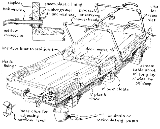 "My stream table," writes Schwartz, "is some three feet wide, 10 feet long and six inches deep. It is hinged so that either end can be raised and it holds 500 pounds of dry sand. The weight of the completed assembly when wet, together with accessories, approaches half a ton. I first made two boxes, each open at one end, of 20-gauge galvanized iron and after soldering the corners I etched the metal surface with dilute muriatic acid and applied two coats of epoxy resin paint. The sheet-metal boxes were then nested for support in close-fitting wooden boxes. Half-inch plywood was used for the bottoms. The ends and sides, which measure two by six inches in cross section, were made of Douglas fir. One box is about four feet long and the other about six feet long. The open end of the larger box was beveled at an angle of 20 degrees to allow the hinged sections to be folded. Three equally spaced cross cleats were spiked to the bottom of each box to give added strength and to provide air space so that water could not collect between the bottom and the supporting surface. One could reduce the cost somewhat by constructing the boxes of rough planks and lining the wood with plastic sheeting. The sand is shifted frequently, however, and thin plastic is not particularly durable. The end sections were joined by a heavy piano hinge and covered by a wide strip of heavy sheet rubber that extends across the bottom and over the sides. The strip was first cemented over the hinge and then secured at the edges by metal strips screwed to the wood. Ordinary door hinges, although not as strong, could be substituted and covered with a strip of opened automobile inner tube. In this case the crack in the bottom and the V-shaped openings at the sides should be covered with loose pieces of plywood to prevent the weight of the sand from pushing the rubber into the openings.