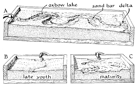 "The larger section of the stream table is equipped with pipe racks for supporting shower heads about two feet above the sand and with a clip on the upper edge of the end for holding a garden hose that leads to a water tap. Rain is simulated by the sprinkler system and stream sources by the open hose. An outlet at the bottom of the smaller section is fitted with a short length of garden hose that can be clipped to the end at various heights for adjusting the depth of accumulated water [see Figure 1]. "Accessories include plastic sheeting, a cement trowel, a few pounds of dry sand and a wave generator. My wave generator was improvised from a small aquarium pump of the type that has a leather diaphragm for a piston. The cylinder, piston and connecting rod were disconnected and a metal rod about an eighth of an inch in diameter and five inches long, threaded at each end, inserted in the end of the connecting rod to replace the screw that held the leather diaphragm. During reassembly the metal rod was passed through a hole drilled in the bottom of the cylinder and a small wooden block was attached to the free end of the rod to serve as a paddle. The completed mechanism was then mounted on a plywood base that is clamped to the side of the stream table where the paddle makes contact with the water. The speed of the motor, and hence the size of the waves, can be controlled by a rheostat. "The apparatus rests on a sturdy platform that is about waist-high. The larger end is raised and lowered by means of an automobile jack and is supported in elevated positions on blocks. In most experiments the smaller end of the table remains level and the larger end is tilted to represent elevated terrain. Coast lines are formed by pushing sand away from the lower end of the table. Sand of any grade may be used, but I prefer the fine white variety used in hourglasses known as Ottawa sand. This material is clean, flows readily and holds its shape nicely when wet. Ottawa sand can be procured from suppliers of building materials. It is currently priced at $5 per 100 pounds in the New York City area. Five hundred pounds fills the stream table to a depth of about four inches. "The operation of the table makes some demand on the experimenter's manipulative skills because the production of realistic effects involves art as much as science. Most experiments are set up by first modeling wet sand to represent some combination of geological features such as mountains, valleys plains or coast lines. The features are then subjected to erosion by streams, waves or mechanical forces. The investigation of land erosion in rainy regions makes a nice introduction to the technique. "The introductory series of experiments assumes a region that has recently been elevated above sea level by natural forces: a uniform, slightly rolling terrain that slopes gradually to the sea. First elevate the larger end of the table about 18 inches and block it in place. Place about half of the sand in the elevated section so that it extends slightly past the hinge into the lower section and cover it with plastic sheeting. The edges of the sheeting should be turned up about an inch on all sides. Place the remainder of the sand over the sheeting so that it extends to within about three feet of the lower end and make a few small piles of sand here and there in the empty area. Wet the sand thoroughly and smooth it from side to side to form a shallow curve down the middle with the edges about an inch above the center. Mold the lower end of the sand to form a steeply sloping beach and give the inland topography a bit of moderate relief here and there. Adjust the outlet tubing so: that the water that accumulates in the smaller section will reach about half the depth of the sand and thus establish an initial shore line. Connect the inlet hose to the shower heads and open the tap to simulate a brisk rain. "Initially the falling drops will merely smooth the surface and the water will soak into the sand. After a short interval, however, small gullies will form near the lower boundary of the rain belt and gradually become longer and deeper until they unite in a single, fast-running stream. As the rainfall continues, erosion will extend the gullies slowly upstream. "In the meantime the main stream deepens rapidly and within a few minutes will have cut a relatively straight channel to the 'sea,' a channel with steep banks and few sand bars. The runoff accumulating at the lower end of the stream table gradually submerges the marine features; bays, peninsulas and islands appear, depending on the prearranged pattern of sand. "After the basin fills note in particular the mechanism of delta formation at the mouth of the river. The current quickly loses its velocity when it encounters the still water, and it deposits a thin, fanshaped pattern of sand on the bottom that extends a considerable distance beyond the mouth of the stream. Geologists refer to this initial deposit as the 'bottom set.' A second deposit, known as the 'fore set,' is characterized by a steep, straight edge that advances over the bottom set. As the top of the fore set approaches 'grade' (the average level of the stream), a thin, gently sloping deposit is laid down on top of the fore set. Thereafter erosion cuts a channel in the top set, and the velocity of the stream, now confined to the channel, increases and initiates a new cycle with the formation of bottom set at the mouth of the new channel. When this cycle has progressed through the stages of fore set and top set, still another channel forms. In this way the exposed surface of a mature delta becomes a fan-shaped patchwork of small islands interlaced by streams. "When the delta has matured, lower the larger section of the stream table so that the terrain slopes about three inches from end to end. This simulates a later stage in the history of the stream's development, when erosion has leveled the uplands. Initially the gullies that appeared be