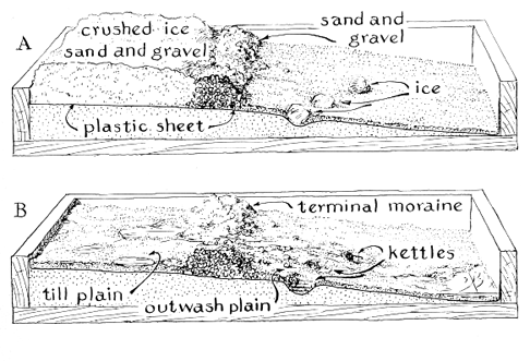 "Other major features of rainy regions are induced by ground water that collects between the surface of the soil and a layer of relatively impervious material underneath. This layer is simulated by the plastic sheeting of the stream table. To set up a demonstration ground water, first shut off the shower heads and drain the accumulated water. Then lower the larger section so that the sand is about six inches higher than it is at the outlet end. Mold a terrain that slopes gradually and, beginning at the high end, form in succession a lake bed, a lowland, a hill with gently sloping sides, and a small basin behind a ridge near the coast line [see illustration]. Detach the garden hose from the shower heads, clip it to the elevated end of the stream table and open the tap. Regulate the flow so that seepage into the sand just balances the inflow and causes the level of the lake to remain constant. Within a matter of minutes the underground water table will form, seep into the lowland and create a swamp. Shortly thereafter a pond will form in the depression near the coast line and one more springs will appear downgrade from the pond, if the edge of the plastic sheeting has been brought close to the surface. Runoff from the spring will gradually fill the basin at the outlet and form a beach. A well dug in the face of the hill above the pond will fill to the height of the water table. "Of the several geological agencies responsible for large-scale alterations of the landscape none is more spectacular in its effect than the action of glaciers. So far I have discovered no way to simulate the slow deformation and flow of ice in the stream table. But it is easy to duplicate the effects of a glacier in the region of its most extreme advance-where the flow of ice has stopped. The glacier simply melts and deposits its burden of transported material. The associated runoff erodes the downward-sloping terrain.