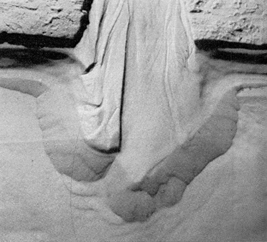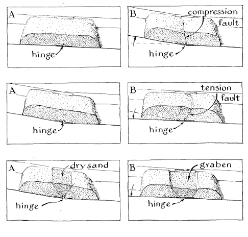 "To investigate faulting of three principal types remove the plastic sheeting from the stream table, place the automobile jack under the larger section and pile the wet sand level with the edges of the table as far as it will extend above and below the hinge. As you jack up the larger section, observe the sand. A crack will appear in the Vicinity of the hinge, and as the larger section continues to rise the block of sand in the larger section will slide below that in the smaller section. This is an example of compression faulting. Note the angle of the fault with respect to the horizontal. Without disturbing the position of the table, smooth the sand at the fault and tamp it down lightly. Then reverse the jack and lower the larger section. A tension fault will now appear. Observe that the angle of this fault makes a large angle in relation to that of the compression fault. Jack up the larger section again, make a deep V-shaped trench across the table above the hinge and fill it with dry sand. Reverse the jack and lower the larger section. Two faults will appear, one on each side of the trench. The surface of the dry sand will drop below that of the wet material and form a 'graben,' a flat-bottomed trench with sloping walls. The upper valley of the Rhine River is a typical example, a depressed area some 200 miles long and 20 miles wide between faults bounding the Black Forest on the east and the Vosges Mountains on the west. "A particularly fascinating series of experiments can be based on the erosive action of water waves on coast lines. Set up the stream table to form a deep basin some three feet square at the outlet end of the smaller section and mold wet sand into a sheer cliff about six inches high. Fill the basin to a depth of some four inches and set up the wave generator to produce waves about two or three inches from crest to crest. After five minutes lower the water to a depth of two inches. Observe the shape of the beach that emerges and particularly how the cliff has been undercut here and there. Such undercutting frequently carves sea caves from the rock, such as the Grotta Azzurra (Blue Grotto) on the island of Capri. Beach formations that stand high above present water levels are common features, such as those surrounding Great Salt Lake in Utah. Wave action is also responsible for such features as the long, thin offshore sand bars that characterize the eastern coast of the U.S. To observe the formation of sand bars, shut off the wave generator and build a smooth bank of sand the width of the tank and extend it into the water about a foot so that the surface of the sand is submerged an inch. Start the wave generator. Wave action will quickly transport sand from the leading edge of the bank to a region behind it, where some of it will form a long offshore sand bar. After a few minutes the growing sand bar will begin to interfere with the transport mechanism and the bottom will stabilize as a profile of equilibrium. Thereafter, if the amplitude of the waves does not increase, the sand bar and shallow basin behind it will remain as permanent features.