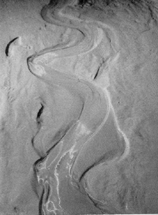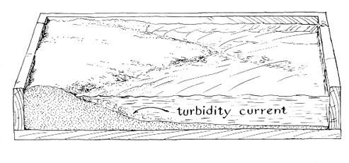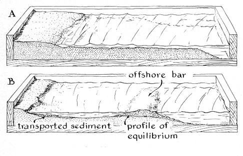 "Wave transport frequently links a small offshore island to the mainland by a sand bar, known as a tombolo. The transported sand may come from the mainland or from the island, depending on the wave action and the nature of the terrain. To simulate the formation of a tombolo, shape an offshore island on a shallow submerged shelf and generate waves that approach the island obliquely. In time the tombolo will form on the leeward side of the island in line with the advancing wave front. The agency of turbidity currents is responsible for the large-scale transport of submarine sediments. These can be simulated by pouring dilute sirup into the water at the edge of a steeply sloping beach. The currents are easy to follow by eye if a few drops of food coloring are added to the sirup. "Numerous other experiments have been made. It is possible, for example, to simulate the formation of pillow lava: the irregularly rounded deposit that forms when molten lava flows into a lake or the sea. The glassy exterior of such pillows is caused by the rapid crystallization that occurs when the lava makes contact with the water. Cavities in the pillows are usually rich in minerals that are derived from gaseous elements trapped in pockets of the molten material. Realistic pillows are formed when molten solder is poured down a steep beach of the stream table. "The apparatus invites much experimental work that remains untried. It should be possible to simulate the flow of glaciers by means of silicone putty or other plastic media, and the features that derive from glacial melting could be developed in greater detail, perhaps by supplementing the melting ice with a water source. Then too, dunes and other effects of wind erosion can be investigated by the experimenter who has access to a source of compressed air. I have reproduced some formations characteristic of arid regions, such as the piles of debris known as talus that accumulate at the bottom of steep cliffs, simply by pushing dry sand over the top of a rise. We are continuing to develop new stream-table demonstrations here at Columbia University that are intended to serve primarily as teaching aids. The apparatus will also be used in a series of research projects."