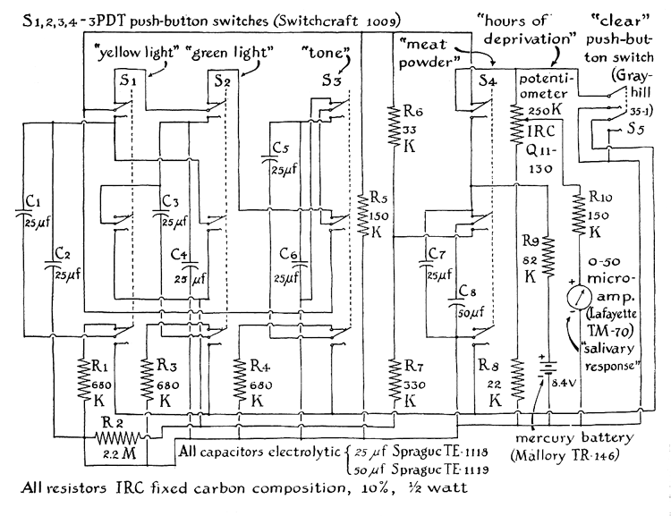 "The design represents a compromise between practical and theoretical considerations. The object was to devise an instrument that would duplicate a wide range of phenomena associated with conditioning, and to keep the cost low. The result is an apparatus that performs well, is inexpensive, rugged and easy to build. It will operate continuously for about three years on a single dry battery. The operation of the circuit centers in the capacitors C7 and C8, which charge continuously through the resistor R9. When the meat-powder switch is operated, C7 discharges through the meter and C8 through R6. When either a light switch or the tone switch is operated in conjunction with the meat powder switch, C7 discharges through the meter and the charge on CS is transferred through R6 to the capacitors controlled by that switch. Once a charge has been placed on the capacitors that are associated with a given switch, the experimenter can discharge the capacitor to the right through the meter by closing the switch. When the switch is released, the capacitor to the left discharges into the capacitor to the right until both attain equal charge. "The operating procedure requires a watch equipped with a second hand, a notebook and graph paper for tabulating and analyzing results. With these materials at hand, depress the 'Clear' switch (S5) in conjunction with switches S1, S2 and S3. This simulates placing a naive dog in the experimental chamber. Then set the 'Hours of deprivation' dial to 10. This establishes the number of hours the simulated dog has been deprived of food. Now depress the meat-powder button. Note the prompt response of the meter. Record the peak amplitude of the response, arbitrarily taking the meter reading as the number of 'drops' of saliva. When the amplitude begins to fall, release the switch and after a few seconds 'present' the meat powder again. Observe that the second exposure to meat powder evokes somewhat less response. Next operate the tone switch and observe that no response follows. The sequence indicates that meat powder is an unconditioned stimulus for salivary response. It evokes salivation even though the experimenter has not trained the dog. Note also that the repeated presentation of meat powder to even a hungry dog-in this case one that has been deprived of food for 10 hours produces successively smaller responses. One would not expect the tone to evoke a response because in this sequence we are working with a dog that has not been conditioned to associate the sound of a bell with food. When plotted, the results resemble the top curve in the accompanying set of three schematic graphs [below right].