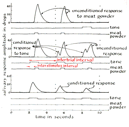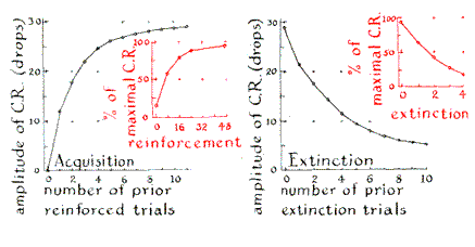 "What happens when a rest period is injected into a period of concentrated learning? Typically it exerts a facilitating effect, called 'reminiscence.' As can be observed with the analogue laboratory, a rest interval after a conditioned response has reached maximum intensity produces an initial rise in the amplitude of the conditioned response during subsequent conditioning trials, followed by a gradual decline to the pretest level. The effect is most pronounced when trials are massed and increases as the duration of the rest is increased. When a rest interval is introduced following a series of extinction trials, it is frequently observed that the response exhibits partial recovery. In general the magnitude of this phenomenon, known as spontaneous recovery, is influenced by the previous level of conditioning, the number of prior extinction trials and the length of the recovery interval. "If a green or yellow light is used in place of the tone as the conditioned stimulus, the results remain virtually identical. Once a stimulus has acquired the capacity to elicit a conditioned response, however, it can be used to bring the response under the control of a second stimulus. This phenomenon is called higher-order conditioning. It was first described by Pavlov in 1927. Experiments on higher-order conditioning can be conducted by developing a conditioned response to tone and then using the tone, rather than meat powder, to condition a response to one of the lights.