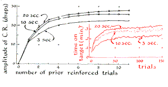 "To obtain an overview of the conditioning process clear the apparatus and, with the dog 10 hours hungry, depress first the tone button and then the meat button as in the first experiment. After 15 seconds depress the tone button again; when the conditioned response reaches peak amplitude, record it, quickly depress the meat button, hold both buttons down until the unconditioned response peaks and quickly release both buttons. Repeat every 15 seconds for eight additional trials. Plot the results. Then extinguish the conditioned response: depress the tone button alone until peak amplitude is reached and record that peak. Do this for 10 trials and plot the results. The acquisition and extinction plots should resemble the large curves in the accompanying graphs [above]. The colored curves placed beside them for comparison give the results of conditioning experiments with human subjects. In the experiments with humans a tone was paired with an aversive stimulus (a mild electric shock). The response consisted of changes in the electrical resistance of the skin, a phenomenon known as galvanic skin response. It is a sensitive index of emotional reactions that interests psychologists because it sheds light on the mechanisms underlying the learning of fear and anxiety. Observe that with the analogue laboratory, as in the experiment with humans, the largest effects during both conditioning and extinction occurred during the early trials. "The analogue laboratory enables one to investigate the variables that affect the acquisition of a conditioned response. Experiments with the instrument show that the timing between the presentation of the two stimuli (the 'interstimulus interval') and the interval between presentations (the 'intertrial interval') [shown in color in middle graph in Figure 4], as well as the duration of the stimuli and the concurrent motivational level (the hunger of the dog), all affect conditioning substantially. Similar effects have been observed in experiments with live subjects. In general the instrument yields reproducible results when a given set of operations is repeated. Certain effects can be obscured by random errors in timing and recording, however. This is an advantage when the apparatus is used as a teaching device: it requires the experimenter to decide whether or not a given observation represents a fortuitous configuration of random errors, and it requires him to devise experiments that will reliably eliminate such results. "One approach to coping with random error involves averaging data from identical experiments with several groups of subjects. For example, the effect of altering the intertrial interval can be explored by running an experiment on three groups of dogs. The analogue laboratory is cleared and set for '10 hours hungry,' and a series of runs is made with meat and tone for the first group of animals at an intertrial interval of three seconds. Identical runs are then made with groups at intertrial intervals of 10 and 20. seconds. If the results are carefully tabulated and plotted, the curves will resemble those of the accompanying graph [Figure 6]. The colored inset graph depicts the behavior of humans in a comparable experiment that required the subjects to learn to hold a stylus on a small disk fastened near the edge of a rotating turntable. In spite of gross differences in procedure the data are strikingly similar. Both experiments tell the same story: Spacing the trials facilitated learning, whereas massing the trials interfered. "The device can also be used to explore the effects of the intertrial interval on the course of extinction, as shown in another graph [below]. The inset depicts the extinction of conditioning in humans, in this case a conditioned eyelid response. In both experiments the massing of trials appears to have speeded the process of extinction.