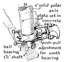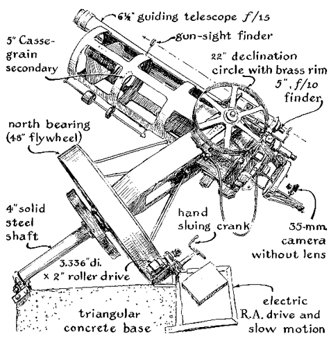 "The circular observatory is constructed of concrete blocks topped by an aluminum dome slightly more than 16 feet in diameter. The dome rolls on eight pulley wheels that ride a circular track of 8/4-inch pipe and is rotated by an electric winch controlled from the eyepiece position. Access to the sky is provided by a pair of quadrant shutters that roll laterally on similar tracks and are .moved by a hand winch. The clear area measures four feet in width and extends from the horizon to the zenith. "In general the telescope is pleasant to use and capable of doing good work. On the other hand, several disadvantages should be mentioned. The optical elements are not easy to collimate, or align, and the field of view is quite narrow- only a tenth of the moon's diameter. This means that the optical axis of the finder telescope must be aligned within 1 1/2 minutes of arc with respect to the primary objective, and this was not an easy task. Until the finder was adjusted to the proper position I had difficulty in locating objects even as brilliant as Jupiter in the main scope, to say nothing of specific stars. The problem of pointing the polar axis directly toward the north celestial pole was even more difficult, in spite of jackscrews for shifting the south bearing laterally in small increments. "Although the construction started as a one-man project, many friends were drafted for specific jobs. The figuring of the objective mirror, for example, was done by Stanley Brower, a former amateur turned professional. Friends also helped me to erect the observatory wall, weld the fork, lay the floor and pour the concrete pier. The heaviest machine work was done in a commercial shop. "No amateur can expect to avoid errors in a project of this size, and I was no exception. I should not, for example, have geared the instrument directly to the motors for rotation in right ascension. I did not know much about observing when I designed the drive or I would have applied the power to the hour circle and linked the hour circle to the polar shaft by a clutch arrangement. The hour circle could then be set as a clock at the beginning of an observing session and the instrument thereafter clamped at any desired right ascension without the need for computing sidereal time when shifting from one celestial object to another. I am now reconstructing the drive to include this feature.
