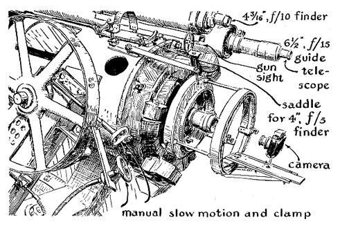 "In its present form the telescope is of the Cassegrainian type: a perforated paraboloidal mirror of f/4 aperture directs converging rays of starlight to a convex mirror on the optical axis that in turn reflects the rays back through the perforation to a focal plane behind the objective mirror. The image can be examined through an eyepiece or photographed. The arrangement enables the designer to fit a relatively long optical path into a short mechanical structure and still achieve the high magnification made possible by extended focal length without sacrificing the convenience of a short instrument. The focal length of objective mirror is 64 inches. Starlight, after reflection by the secondary convex mirror, comes to focus at the optical equivalent of 256 inches. Objects examined through an eyepiece of one-inch focal length are magnified 256 diameters; objects viewed through an eyepiece with a focal length of six millimeters are magnified 1,085 diameters. At this maximum magnification the moon is seen at an apparent distance of about 230 miles and can be picked apart crater by crater. The mechanical structure, or mounting, that supports the optical parts in physical alignment and keeps them trained on a desired star or other celestial object resembles the design proposed the late Russell W. Porter, who with Ingalls founded amateur telescope making as a hobby in the U.S. Essentially the structure consists of a skeleton tube suspended by bearings between the tines of a stiff fork that rotates about an axis parallel to that of the earth, as shown in the accompanying drawing [below]. The tube, in addition to supporting the mirrors and eyepiece, serves as the mounting for a 6.5-inch achromatic telescope of 96-inch focal length that is used for guiding the instrument when photographing stars. It is an excellent instrument in its own right, it resolves to Dawes's limit and presents a flat field substantially free of color. The tube also mounts two smaller achromatic telescopes of four and 4-3/16 inches respectively that serve as finders.
