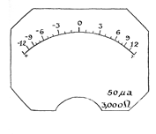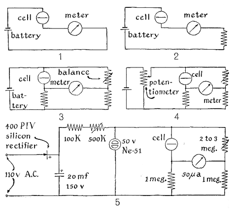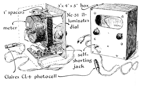 [Figure 6]. This simple arrangement would work, but examination of the circuit discloses two obvious disadvantages. First, accidental exposure of the photocell to bright light would minimize the photocell resistance and the resulting high current could damage the microammeter. This defect can be corrected by inserting a limiting resistor in the circuit to keep the current to a safe value when the photocell is short-circuited, as shown in the second schematic diagram. The other disadvantage stems from a common property of all photocells: their resistance rises to maximum but does not become infinite in the absence of light. The current of constant minimum amplitude transmitted by photocells even in total darkness would deflect the needle of the microammeter to some point on the scale above zero, thereby wasting a portion of the scale. Most experimenters prefer light meters that indicate zero in darkness and full-scale deflection when exposed to light of maximum intensity. This can be achieved by two more modifications of the basic circuit. The first modification balances out the 'dark current' and the second provides an adjustment for controlling full-scale deflection. To balance out the dark current a variable balancing resistor is connected across the cell and microammeter and a fixed resistor across the microammeter and current-limiting resistor, as shown in the third diagram. The circuit configuration now constitutes a bridge, with the photocell and balancing resistor forming the upper branches of the bridge and the fixed resistor and current-limiting resistor forming the lower branches. The micro-ammeter connects across the center of the bridge between the upper and lower branches. If the resistance of the variable resistor is adjusted to equal that of the photocell in darkness and the resistance of the current-limiting resistor is selected to match that of the fixed resistor, the bridge will be balanced when the photocell is in darkness and each side will transmit equal current. No current will then appear in the microammeter. In effect, the dark current has been balanced out. The problem of adjusting the circuit for maximum meter deflection when maximum light falls on the photocell can be solved by installing a potentiometer across the battery for adjusting the voltage applied to the bridge circuit, as shown in the fourth diagram. "A meter so constructed would work, but I wanted mine to operate from ordinary 110-volt, 60-cycle house current. So I added a rectifier and a small neon lamp that doubles as a light for the microammeter scale and as a regulator for maintaining the rectified voltage at constant amplitude. The final form of the instrument is shown in the fifth diagram. "It turns out that the sensitivity of the meter is high at low values of light intensity and progressively less sensitive at higher intensities. This is an advantage because the measurement that determines exposure is made in the darkest area of the negative image, where maximum sensitivity is needed. A new scale was made for the meter and calibrated so that each scale division corresponds to one stop of the enlarger lens, or a factor of two in brightness. This conforms to the standard ASA scale used on exposure meters Each of the divisions was then subdivided into three parts, which represent a change in density of .1, as shown in the accompanying drawing [Figure 7]. "All components except the Clairex CL-4 photocell are assembled in a standard apparatus box five inches high, four inches wide and three inches deep. A window in the front cover provides access to the scale of the microammeter, which is mounted behind the front cover on tubular spacers and long bolts. The neon lamp is located behind the front cover and beneath the window to shield the cell from direct exposure to the lamp. "To relate the light measurements to the characteristics of printing papers, I test each batch of paper as it is opened. For this purpose I made a test negative by masking a strip of process negative in increments and doubling the exposure of each increment to produce a 10-step gray scale. With this test strip in the enlarger, I determine for each paper the stop that causes a dark area of the negative to produce a barely discernible high-light gray in a print exposed for 15 seconds and a light area to produce a black just short of maximum. The next step is to take a meter reading, at the easel, of the light and dark areas of the negative image with the enlarger set at that stop. The difference between these two measurements is my contrast index for the paper in question. Depending on the individual meter, differences of 1, .8, .7, .6 and .5 may be found to characterize papers of contrast grades 0, 1, 2, 3 and 4 respectively. "To print a negative, finally, insert it in the enlarger and open the lens until a meter reading in the darkest area of the negative image indicates that the high light will just register. Then take a reading in the lightest area. Subtract the lower reading from the higher one to find the difference between the two. Select a paper that matches this difference. A print made with this paper exposed at this lens opening for 15 minutes and developed as recommended by the manufacturer should come out right on the button."