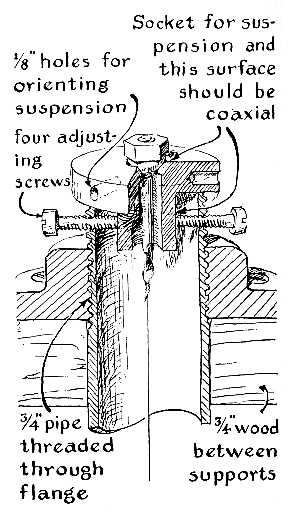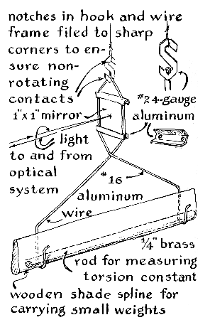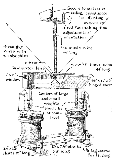 Epstein writes: "Essentially the Cavendish apparatus is a sensitive torsion balance and a balance arm suspended at the middle by a slender steel wire. A small lead weight suspended from each end of the arm is attracted to large weights by mutual gravitation. The rotation of the arm varies with the intensity of attraction and is measured by the deflection of a light beam from a small mirror fixed to a pair of hooks that support the balance arm, as shown in the accompanying illustration below]. "The complete balance assembly including the case is supported from the ceiling by a length of 3/4-inch pipe that terminates in flanges. The structure is braced by a set of three guy wires. The torsion wire attaches at the upper end to a special fitting that rests in the top end of the pipe: a brass flange and cap nut drilled and threaded to receive a small rod with a hook at one end for attaching the wire. The flange is centered in the pipe by four adjusting screws and can be rotated for adjusting the orientation of the wire and balance arm. The lower end of the torsion wire attaches to an S-fitting that engages a pair of wire hooks to which a small mirror fixed.