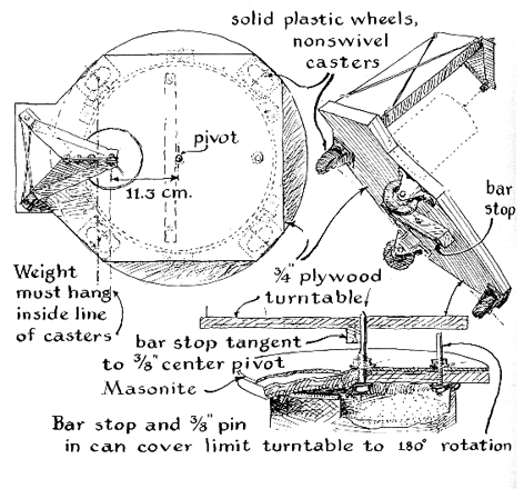 "The remaining apparatus, including the large weights, is mounted on a wooden platform that in turn rests on legs in the form of inverted lag screws, which serve as leveling adjustments. The platform carries two metal pails filled with sand; these act as massive supports for a pair of turntables used to shift the position of the heavy weights. The turntables roll on casters of the nonswiveling type that ride on Masonite disks laminated to plywood atop the metal pails. A 3/8-inch pivot anchored in the center of each plywood disk engages a companion hole in the center of the turntables. The pivots keep the turntables centered when the position of the attracting weights is altered. The gravitational attraction of the mass represented by the sand in the metal pails acts vertically on the small weights and therefore exerts no turning force on the balance arm. The attractive force of the brackets from which the large weights are suspended, however, can influence the motion of the arm and must be minimized. This is accomplished by making the brackets in V-sections of thin aluminum sheeting and providing the necessary strength by means of wire braces. "Lead is an ideal material for the weights because of its high density, cheapness and low melting point. (Any other substance can be used, however, because all matter exerts gravitational attraction.) Lead can be bought in most plumbing establishments, where arrangements might also be made for melting and casting the weights. The construction requires about 75 pounds of lead. Standard fruit-juice cans of 46-ounce capacity serve as forms for the large weights. Make the castings by embedding clean, dry cans almost to the top in moist sand or earth and filling them to the brim with molten lead. Lead shrinks on cooling, so that more than one pouring is necessary. The sand absorbs heat from the sheet metal and keeps their soldered joints from melting. If the cans are not completely dry, the molten lead may spatter and cause severe burns. A face shield, hat, gloves and a garment with long sleeves should be worn for safety. Do not melt more lead at one time than can be safely carried and poured. Let the castings cool for at least an hour before removing them from the sand or earth. Then drill and tap the lead to take an accurately centered screw to which suspension hooks are attached. Each completed unit should weigh 16.8 kilograms. Although their weight need not be precisely this amount, the weights of each must be the same and should be determined to within 100 grams. The weights are equalized by filing lead from the heavier of the pair. After the weights have been suspended from the aluminum brackets and mounted on the turntables, measure and record the distance between the suspension wires and the center of the turntable to the nearest millimeter.