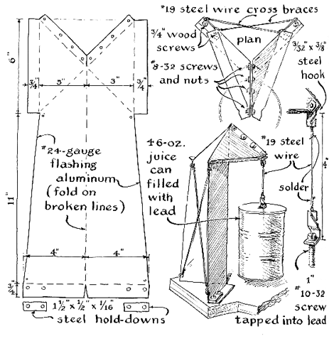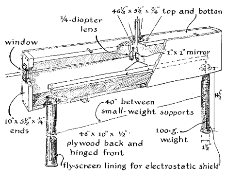 "The small weights carried by the balance arm are much easier to make. Simply stand two 1/2-inch brass tubes with 1/32-inch walls on a smooth metal surface and pour in the lead. The tubes should be about four inches long to allow for shrinkage when the lead solidifies. When the lead is cool, saw an inch from the tops and square the ends with a file Each weight is then drilled and fitted with a small screw eye; these must be accurately centered because the suspension wires are presumed to pass through the center of mass of each weight and the distance between the centers of mass of the large and small weights must be subsequently determined by measuring the distance between the suspending wires. The small weights, of about 100 grams each, must be equal and measured to the nearest gram. "The balance-arm assembly is enclosed by an airtight case that includes a pair of metal-lined tubes for shielding the small weights. These shields can be made of clear plastic sheeting rolled and cemented. The electrostatic shielding that lines the tubes can be made of copper fly screen and is electrically connected to the grounded pipe support and guy wires. One side of the case is hinged for a door and sealed with weather stripping.
