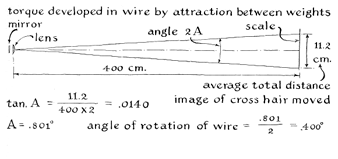 "In order to measure the force required to twist the torsion wire, first carefully mark on the arm the points at which the balance arm rests in the suspension hooks; then remove the balance arm and small weights and replace the assembly with a brass rod a 1/4-inch in diameter that equals the total weight of the balance-arm assembly to within a gram (The balance-arm assembly of my apparatus weighs 239 grams and the length of my 1/4 inch brass bar of equal weight is 35 inches.) Center the brass bar carefully on the suspension hooks and, after the image of the cross hair has come to rest on the scale, give the brass rod a slight impulse to set it in oscillation and then close the door of the case.