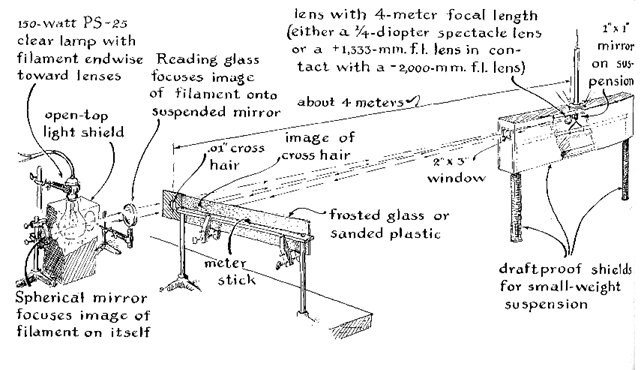 "Any optical system that can project a reasonably sharp image of a cross hair can be used to indicate the position of the balance arm. I improvised a system that uses a clear Mazda lamp for the source and a common reading glass and spectacle lens for focusing the image of a fine wire on the screen, as illustrated in the accompanying drawing [Figure 8]. Doubtless a satisfactory substitute could be constructed around a 35 millimeter slide projector. "When the balance has been assembled as illustrated, carefully center the balance arm on its suspension hooks and hang the small weights in their shields. Measure and record the distance between the small weights to the nearest millimeter. If the arm is properly centered, this will be twice the length of the lever arm through which the force of gravitational attraction is exerted on the torsion wire as a moment, or twisting force. Now turn the adjustment head at the top of the suspension pipe to position the balance arm longitudinally with respect to the case. If the torsion wire has been twisted during installation, several turns may be required to align the balance arm. The balance arm can be considered properly aligned when the. small weights remain centered in the shielding tubes following an adjustment. Because the balance is sensitive and oscillates at a frequency on the order of only about one cycle per 10 minutes the inexperienced operator may tend to overshoot in making this adjustment. Make the final adjustments in small increments and wait at least 10 minutes between adjustments for the arm to respond. After centering the arm, align the optical system and thereafter observe the movements of the balance by measuring the movements of the cross hair on the scale.
