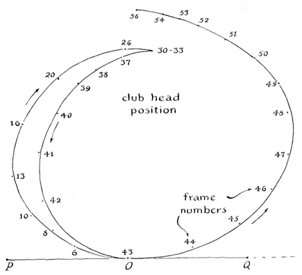 "The next step is to plot the position of the club head during the course of the swing. Since a point in a plane is determined by its distance from two other known points, the position of the club head can be plotted in relation to that of the two tee markers [see illustration below]. First, I draw a base line near the bottom of a sheet of graph paper ruled with rectangular co-ordinates and on it locate three equally spaced points: the tee marker P, the ball (O) and the tee marker Q. I usually space these points four inches apart, thus establishing a scale of 12 inches of club head travel per inch of graph paper. "The location of the club head (C) with respect to that of the tee markers can be transferred to the graph by one of three methods. Proportional dividers are handy for transferring the scaled distance from P to C and from C to Q. Alternatively, the angles CPQ and CQP can be measured with a protractor and reconstructed on the graph, point C being located at the intersection of lines projected from P and Q. If no protractor is at hand, the vertical and horizontal distances between C, P and Q can be measured with a square and ruler and similarly transferred to the graph. "Plot enough points to establish a reasonably smooth track, skipping several frames du mg slow portions of the swing. The resulting graph is of course not extremely accurate. The plane in which the club head swings, for example, is inclined to the plane of the film. The track plotted from the image therefore differs slightly from the true excursion of the club head, but the error is not large and can be ignored. By the same token, the travel of the club head from point to point is subsequently measured along straight lines, whereas the club head actually follows a curved path. Error introduced by this source can be minimized by speeding up the camera. My camera, an inexpensive one, is limited to a maximum speed of 48 frames per second, a rate that records the event adequately for the objectives of this experiment.