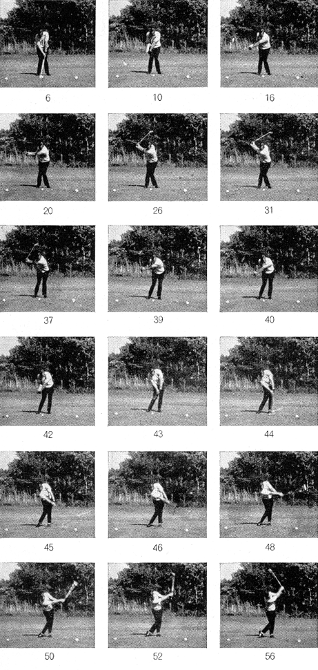 "The procedure is essentially simple," writes Graham, "but the reliability of the results will reflect the care with which certain measurements are made. I pick a sunny day for the experiment and, having arrived at the golf course with my co-operative friend and accessories, tee my ball. Then I place a tee marker precisely four feet in front of the ball and another four feet behind it to make a line that points toward the first green. My friend stations the tripod-mounted camera for a medium close-up shot on a line that intersects the ball at right angles to the tee markers. I address the ball, facing the camera. My friend photographs the complete drive from address to follow-through at the rate of 48 frames per second. The known distance between the tee markers and their position in relation to the club head scales the pictures with respect to distance. The exposure rate-the number of frames per second-of the camera provides the time dimension. (If the exposure rate is not known accurately, it can be calibrated by photographing a phonograph turntable marked with a chalk line and turning at 45 or 78 revolutions per minute.) "The film is developed and analyzed. One can use either a film-editing device that projects an enlarged image of each frame or a set of enlarged prints of each frame, mounted serially and numbered for identification.