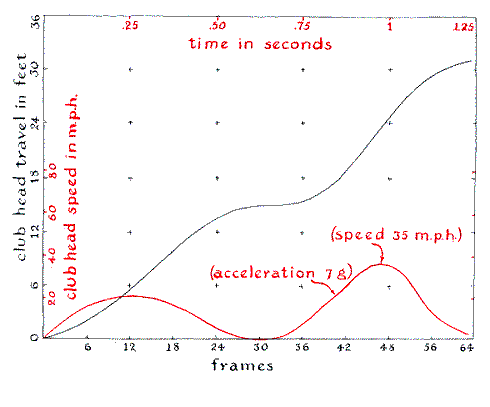 "Club head acceleration can be graphed in the same way or merely computed from the graph of club head speed at frames of particular interest, such as the frame showing the moment of impact. For example, to determine the acceleration of the club head depicted by frame No. 38, draw a tangent to the graph at this point. Then, at some arbitrary point above, say at the point corresponding to a velocity of 56 miles per hour, drop a perpendicular MN from the tangent. At another arbitrary point below, say at the point corresponding to a velocity of 12 miles per hour, draw a line LN parallel to the abscissa and intersecting both the tangent and MN. Inspection of the abscissa discloses that the length LN is analogous to a time interval of .1 second. Acceleration is defined as the rate of change of velocity and is equal to the difference between the final velocity and initial velocity divided by the time interval between the two. In this example the velocity difference is 56 miles per hour minus 12 miles per hour, or, expressed in feet per second: (56 - 12) X 5,280/3,600 = 64 feet per second. The acceleration is 64/.1 = 640 feet per second per second. The acceleration of gravity (g) amounts to 32 feet per second per second. The acceleration of the club head at frame No. 38 in terms of g is accordingly 640/32, or 20 g! "Having performed this rainy-afternoon portion of the procedure, what reward awaits the duffer? For one thing, he can see at a glance why his drives do not match those of a professional golfer. The graphs discussed so far show the performance of golf professional Dick Bull using an iron. His swing from address to follow-through required 1.17 seconds. The club head traveled 31 feet. His backswing occupied .6 second. He paused at the top about .1 second. More interesting than these figures, in my opinion, are those of the club head speed and acceleration Bull achieved: the increase in club head speed during the .1 second before impact from 15 miles per hour to an amazing 70 miles per hour, representing an acceleration of slightly over 20 g. Graphs of Bull's performance with a driver, although different in many respects from those of his irons, show exactly the same figure for speed, 70 miles per hour, and an acceleration of 22 g, a remarkably uniform performance. Similar analysis of the performance of a fairly good amateur using a driver shows precisely half the velocity of Bull's club, 35 miles per hour, and an acceleration at impact of only seven g [see lower illustration below].
