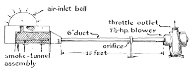 "Air is conducted to the test nozzle through a rectangular tube of plywood that flares at the entrance to the inlet bell to prevent separating of flow at a sharp corner. The flare is made by butting the tube against a pair of radius blocks. The smoke is injected into the air by the nozzles of the seven copper tubes, grouped in a semicircular array of five-inch radius symmetrical with respect to the outlet tube. "The entire front and the left end of the tunnel, as well as the left wall of the nozzle duct, are made of transparent plastic so that air flow can be observed and photographed. A light box fitted with three floodlights illuminates the nozzle and the tunnel from the left. The tunnel is 3 1/2 inches deep, 24 inches high and 72 inches long. The inside back wall is painted flat black. The movable floor is sealed by weather stripping at the sides and the left end. It can be raised or lowered as necessary by means of wooden dowels that pass through rubber grommets in the bottom of the tunnel, and it can be fixed at any level by clamps that secure the dowels. Air leaves the tunnel at the right through a duct six inches in diameter and 15 feet long containing a square-edged orifice station at which the flow is measured. Air is pulled through the system by connecting the exhaust duct to the inlet of a 7 1/2-horsepower blower that moves 920 cubic feet of air per minute at a reduced pressure of about two inches of mercury. I control the flow by throttling the discharge from the blower.