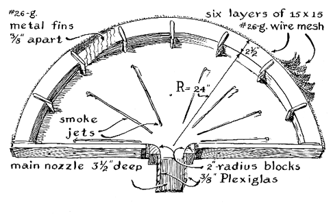"To achieve the stable flow of air required for the accurate measurement of air flow in two dimensions, the apparatus was equipped with a semicircular inlet chamber, resembling half of a shallow cheese box, for smoothing the turbulence of the air in the room. The curved edge of the chamber is made of eight semicircular strips of 26-gauge sheet metal spaced 3/8 inch apart. The sheets are supported by eight slotted, streamlined struts four inches long. The sides are closed by two semicircular sheets of 1/4-inch plywood and the bottom by a straight piece of one-inch plywood with a rectangular outlet for the test nozzle, as shown in the accompanying illustration. The sides must be braced externally to prevent bowing that would disturb the flow. Air enters the sheet-metal slots through six layers of fly screening. This construction limits the velocity of air flowing from the room into the screening to about 15 per cent of the jet velocity at the point where air enters the tunnel. "The smoke system is supported on the front face of the air-inlet unit. It consists of a forced-draft burner that admits tobacco smoke to a pulsing apparatus from which puffs of smoke are delivered by Tygon tubing to a set of seven 1/8-inch copper tubes mounted in a radial array inside the inlet bell, as illustrated. The smoke generator consists of a straight metal tube two inches wide and 16 inches long closed at one end by a rubber stopper drilled for a cigarette or cigar holder and supplied with air at the other end by an electric hair dryer. Pressure inside the smoke generator is adjusted by a controlled leakthree slots that can be adjusted in size by a sliding rubber sleeve.