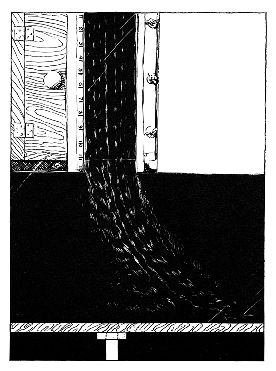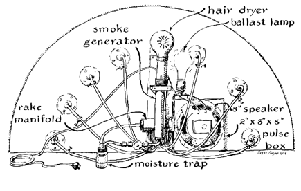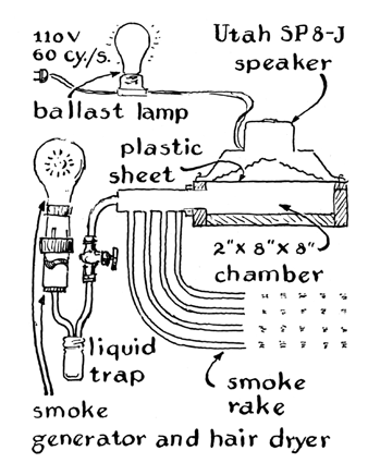 "The tubing that connects the smoke generator to the pulsing vessel includes a wide-mouthed bottle closed by a screw cap fitted with an inlet and an outlet. The bottle acts as a moisture trap for condensate that would otherwise collect at low points in the tubing and interfere with the even distribution of smoke to the rake assembly. (The design of the trap could be improved. My trap increases the running intervals between cleanouts, but considerable moisture condenses in the tubes.) The smoke, passing through the trap, enters one end of a 1 1/2-inch manifold and leaves through seven individually controllable smoke lines tapped into the side of the manifold. The smoke lines are made of transparent tubing so that the presence of condensate can be checked before the start of each run. The flow through the individual lines is regulated by pinch valves. The other end of the smoke manifold opens into one side of the pulsing chamber. "The pulsing chamber consists of a box two by eight by eight inches made of one-inch plywood. The lid of the box is a square of plywood with a circular hole for mounting an eight-inch high-fidelity loud-speaker. The loud-speaker is sealed to the plywood around the perimeter. A thin plastic diaphragm separates the loud-speaker from the pulsing chamber to prevent smoke from diffusing through the porous paper of the speaker cone, as shown in the accompanying illustration below.