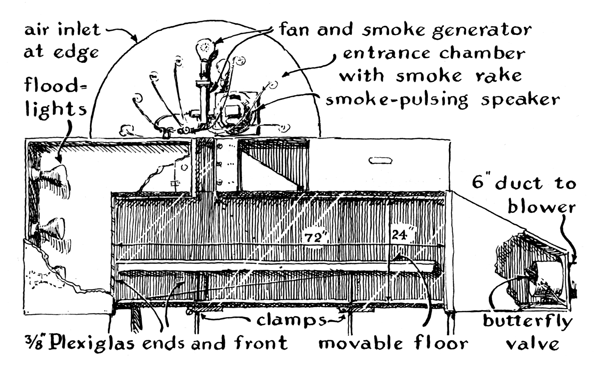 "The tunnel has seven principal sections," writes Moffat, "an air-inlet bell, the smoke system, the test nozzle, the tunnel body, the lighting system, the blower and air controls and the flow-measuring station [see top illustration at right]. Because the tunnel was designed to investigate the aerodynamics of hover craft, the apparatus was fitted with a single nozzle that directs air at right angles against the floor of the tunnel. The floor, which simulates the ground, can be fixed at any distance between two and 20 inches from the jet for investigating the behavior of air flow in the range of low altitudes within which these craft normally fly.