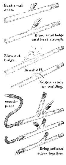 You now have an ampoule for holding liquids or other specimens. Place the specimen inside the ampoule. To seal the container first tilt the propane torch so that the flame burns horizontally. Hold the ampoule vertically and rotate the constriction in the flame. When the glass softens, insert one point of the tweezers inside the open end to prevent the glass from drooping. After the glass reaches a distinct red color close the tweezers and pull the solid end away while continuing to rotate the ampoule. The thin thread will melt in the flame. Gradually lower the closed, tapered end out of the flame and, while maintaining the ampoule in the vertical position, coat the hot glass with soot and anneal in cotton. If the ampoule contains a liquid that would be altered by heat, the lower half of the glass can be kept in a container of ice water throughout the sealing operation. It is easy to join two glass tubes of equal diameter or to make a T joint, particularly between tubes of unequal size when the vertical leg of the T is the smaller tube. First close one end of each tube to be joined by the procedure outlined for making a test tube Then, instead of annealing the hemisphere, heat it to a bright yellow, remove the glass from the fire and blow quickly and strongly into the open end [see top illustration in Figure 2]. A large bubble of glass will form and burst into fragments so thin that they glow with the iridescence of a soap bubble. Brush the fragments from the end thus flared. Prepare one end of the other tube in the same way. Close the nonflared end of one tube with a cork and fit the second tube with the blowing cork. Rotate both flared ends in the fire until the ragged edges heat to redness. Remove from the fire, quickly lift the ends to eye level and move them into contact as a matching joint. The redness need not extend more than a sixteenth of an inch into the glass. Some workers prefer to hold the tubes at the angle of a shallow V so that initial contact is made at one point on the rim of each tube. This point of adhesion then serves as a hinge for guiding the ends together. Both tubes must be grasped and rotated synchronously at their respective balance points. This too may sound difficult. It is not. Hot glass behaves like heavy glue. It is just as sticky and strong. If the tube tends to bend at the joint, a slight pull, together with a corrective bending force, will put it right. The straight joint is now rotated in the fire. As the glass heats, the joint will tend to shrink and thicken. When the glass becomes plastic, remove the work from the fire, allow the thinner portions to cool and then blow until some part of the joint expands to the diameter of the unheated wall. Now inspect the joint for the lowest, most shrunken portion. Without rotating the tube, heat this portion, remove the work from the fire, let the thin portions cool, then blow to expand this portion to the uniform diameter of the tube. Continue to work around the joint locally in this manner until its size and shape match that of the tubing. If a ragged accumulation of glass from the flared ends appears at any point, heat it locally and, while the glass is in the flame, alternately suck and puff gently while inspecting the heated portion. The hot glass will alternately shrink and expand, an action that will cause the ragged portions to merge with the neighboring glass. When the joint is complete, carefully anneal the work. To make a T joint, stopper one end of the piece that will serve as the cross of the T and fit the blowing cork into the other end. Heat the middle of the tube gradually all around in a four-inch flame by the combined motions of stroking and rotating the glass in the flame. Experience will now enable you to judge when the glass approaches the plastic state. Immediately before this state is reached reduce the flame to about two inches and hold the glass still to heat a point at the middle of the tube. The heated spot should just make contact with the tip of the inner cone of the flame. When the glass begins to color the flame yellow, remove the tube and blow gently until the softened glass bulges slightly at the heated area [see Figure 3]. Do not wait for part of the area to cool. When a slight bulge forms, return the glass to the fire, reheat and blow again. The object is to blow a bulge equal in height to the radius of the tube. The width of the bulge at the level of the unheated portion must equal the diameter of the tube that will form the leg of the T. These proportions are easily judged by eye. The novice is advised not to try to form the bulge with a single heating of the glass. Puff it out in easy stages. When the desired size has been achieved, return the bulge to the flame and heat it strongly in the middle until the spot of red-hot glass is slightly smaller than the inner bore of the tube that will become the leg of the T. Then remove the work from the fire and blow off a bubble. Brush the glass fragments from the edges of the hole thus formed. Gradually reduce the temperature of the heated portion by moving the glass in and out of the hot region beyond the colored part of the flame, but do not anneal. Next similarly flare one end of the tube that will serve as the leg of the T. The flared end is then joined to the flared hole by much the same procedure as was used for making the straight joint. The edges are heated, one on each side of the flame, until the glass becomes red all around to a depth of about a sixteenth of an inch. The mating edges are then pressed together lightly and the joint is returned to the fire. Allow the flame to play on the solid neighboring portions of the glass occasionally so that they will not become appreciably cooler than the joint.