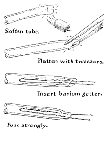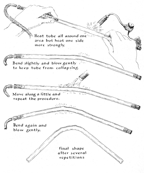 The object now is to heat the joint locally and blow the mating faces slightly outward into a conical fairing. During this operation the leg of the T must be supported at right angles with respect to the crosspiece. Only a slight force need be applied because the glass is fairly solid except at the heated area. Local heating and blowing are continued until the fairing is complete. With experience you will find that glass becomes plastic enough for blowing curves like this before it reaches a red heat. Use the lowest temperature that will accomplish any desired result. Working at minimum temperature not only makes the job easier but also avoids a destructive effect known to glassblowers as devitrification. Devitrification occurs when glass is maintained above a certain critical temperature for extended periods. The ingredients of the glass tend to separate from one another and clump in the form of crystalline masses. Devitrified glass loses its transparency and other desirable physical properties; it looks frosted and burned. Occasionally experiments require electrical connections to be made between the inner and outer portions of a sealed glass vessel. They are easy to install after the beginner has made a few T joints. First, flare the end of a piece of tubing by exploding a bubble then heat and flatten the other end slightly, as shown in the accompanying drawing [Figure 4]. For the conducting leads I frequently salvage the filaments from old vacuum tubes or discarded lamp bulbs. The bulb is placed in a strong paper bag and squeezed between the jaws of a vise until the glass breaks from the leads. The wires are then arranged in the flattened glass stem as illustrated. The stem is first brought gradually up to temperature to prevent cracking. The wires are next heated to a bright yellow by concentrating the hottest part of the flame on the metal at the point where it enters the tube. The glass is now heated to redness and squeezed in contact with the wires by means of the tweezers. Heating is continued until the glass reaches an orange color and "wets" the metal. If the wires are not first heated to a bright yellow the metal will react with the molten glass to produce tiny bubbles: literal a froth that ruins the glass-to-metal seal. When completed, the seal must be carefully annealed. I am told that filament from lamps and vacuum tubes is not recommended for use with soda lime or lead glass because its coefficient of expansion differs from that of the glasses enough to invite cracks and leaks, but I have experienced no difficulty when the glass has been fully annealed. Incidentally, copper will seal to soft glass splendidly when the metal is reduced to a foil on the order of .005 inch thick. Suitable lengths of wire thick enough to carry the anticipated current are simply pounded flat with a hammer over the length that comes in contact with the glass and heated to the same temperature as the glass when the seal is made. The worker must be careful not to overheat and melt the copper. The copper takes on a distinctive and easily recognized color along the portions that are wetted by the molten glass. I have used copper seals successfully for firing barium getters: devices that evaporate a thin film of metallic barium onto the internal surface of the vacuum tube for absorbing unwanted gases. Getters are customarily fired by induction heating, which requires a source of high-frequency current. Sealed leads enable the amateur without access to induction-heating equipment to accomplish the same result with an automobile storage battery or a doorbell transformer. What about bending glass tubes and blowing large bulbs? Simple bends are no problem, particularly in the case of tubes less than eight millimeters in diameter. To make bends, fit the torch with the burner that produces a broad, bushy flame. If possible, add a batwing attachment to spread the flame in a fan-shaped pattern. Then, supporting the tube at positions about a quarter of its length from each end, bring the center portion slowly up to temperature; let the glass sag in the form of a natural bend that can be stopped at any angle. If the bend is desired at some point other than the center, judge the approximate balance points for supporting the glass and proceed in the same way. When bending tubes, as in most operations with hot glass, the heat must be evenly distributed by rotating the glass. Tubes of greater diameter are bent by gradual steps. The glass tends to buckle along the inner radius of the bend or, conversely, to flatten along the outer radius, particularly in the case of large tubes with thin walls. These imperfections are continually corrected by local heating and blowing [see Figure 5]. As for blowing large bulbs, my advice is: Do not try unless you really can trace your ancestry to Venice. If you need a large bulb, make one from a round-bottomed flask.