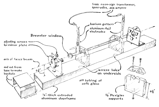 What accounts for this remarkable performance? You can discover the answer by the pleasant if somewhat slow method of undertaking to build a laser at home, as I did earlier this year. Not only will you learn what makes the laser tick but also, as a bonus, you may encounter some fascinating properties of light that you have previously overlooked. If you are as inexperienced as I was, however, you may not find the project as easy or as inexpensive as some that have been discussed in these columns. I can promise that it will exercise your talents for such diverse arts as blowing glass, fabricating small parts, maintaining scrupulous cleanliness in the workshop and operating a high-vacuum system. The cost will vary inversely in proportion to your capacity for improvisation, but you can expect it to exceed $100. The gas laser requires special structures, the need for which arises because the device is an extremely poor amplifier, at least by electronic standards. In the visible region of the spectrum it usually has a maximum gain of less than 10 percent. Much of the input power is wasted by excited atoms of ionized gas that emit light in random directions. Some emission, however, travels along the axis of the gas-discharge tube and is reflected back and forth between the mirrors. During each transit this oscillating light stimulates still other excited atoms to emit energy that falls into lockstep with the same waves that triggered the emission. The stimulated emission thus increases the intensity of the light, but only by a few percent on each pass. During each transit the light must make its way through the end windows to the mirrors and back again. These surfaces are obstacles that can introduce major losses both by absorption and by reflection, as is evident from what happens with an ordinary glass window. When light falls at right angles on such a window, about 4 percent of the energy is reflected back to the source by each of the window's two surfaces. A lesser amount is also absorbed, being transformed into heat by the glass. In an imperfectly aligned window of the laser these losses combine to reduce the intensity of a ray more than 16 percent in the course of a single pass, more than is gained from the stimulated emission. Perfect alignment of a laser window is impossible.