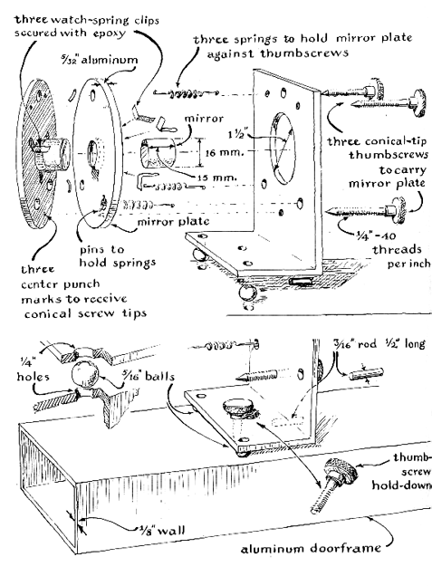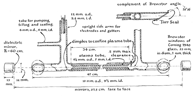 The range of tube diameters that can be used in the laser is restricted by the nature of ionized gas and by mechanical considerations. At pressures much lower than .5 torr the electrons acquire enough energy to damage the glass envelope by impact and to erode the electrodes. The metal vaporized in this way condenses on the envelope and in the process buries gas atoms, lowering the pressure still more. Thus a runaway effect develops that causes the tube to fail. An envelope that contains a plasma tube six millimeters in diameter ought to be filled, according to the formula given above, to a pressure of 3.6/6, or .6 torr. With a laser of the type I built the life of a tube filled to this marginal pressure would be impractically short. I use a plasma tube with a diameter of two millimeters, and I overfill it to a pressure of 2.7 torrs. Tube diameters of less than about one millimeter become awkward to align and have other drawbacks. In general the output of a laser increases in proportion to the product of the length times the diameter of the plasma tube. This suggests that long tubes are more powerful than short ones. Again there is a catch. Short tubes operate readily at 6,328 angstroms, whereas those a meter or more in length tend to function in the infrared region instead of in the visible part of the spectrum. I am told that long tubes can be forced to work in the visible range by the strategic placement of magnets along the tube, but I have not tried the experiment. Tubes ranging from 15 to 40 centimeters in length appear to work quite adequately in the visible region. Mine measures 34 centimeters. The mirror system functions somewhat like a resonator. It can consist of various combinations of spherical and flat mirrors. A system that is easy to adjust and to maintain in adjustment employs a pair of facing spherical mirrors separated by slightly less than one radius. My mirrors were figured to a radius of 60 centimeters. The spherical surfaces have a separation of 57.5 centimeters. The mirrors are mounted in easily adjustable cells supported by fixtures that can be removed and returned to the base without disturbing the alignment of the mirrors with respect to the axis of the tube. All essential dimensions of the laser's hardware, of the light projector used for aligning the mirrors and of the miter box for sawing the envelope at the Brewster angle are specified in the accompanying illustrations. Alternate design schemes are possible and perhaps desirable. The reader is encouraged to improvise.