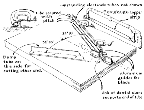 The getter-electrode assemblies are installed in two short lengths of glass tubing that become side arms of the glass envelope. One side arm is equipped with a smaller tube for exhausting and backfilling the envelope. I then flare the ends of the plasma tube alternately by blowing a small bulb on one end, exploding the softened bulb and shrinking its circular edge in the fire until, by trial and error, the flared end fits the inside of the envelope to within a half-millimeter, or closer if possible. A dimple is next sucked in the envelope as a stop for the plasma tube. The outside of the plasma tube is cleaned with fuming nitric acid, rinsed with distilled water, dried in the flame and slipped into the envelope against the dimple stop. The second dimple is then made in the envelope to secure the tube loosely. Next the side arms containing the getter-electrode assemblies are joined to the envelope. Incidentally, if you have the glasswork made commercially, you will miss a lot of fun. Working with hot glass, particularly in the case of simple apparatus such as this, is not nearly so difficult as is commonly supposed. I discussed glassblowing in this department in May. The glass construction is completed by sawing the ends of the tube at the Brewster angle. If you have access to a diamond saw equipped with an accurate fence, the job will take about three minutes. If not, build the miter box shown in the bottom illustration in Figure 5. With this device the cuts will require about 10 minutes each. Keep plenty of abrasive slurry on the copper blade, let the weight of the saw do the work, use about 60 strokes a minute and take it easy as the saw cuts through the glass. Before making the cuts, plug the ends of the tube with wads of clean absorbent cotton and cement the glass to the right-angled aluminum holder. The cut ends must be lapped to make a vacuum-tight fit with the Brewster windows. Begin the lapping operation with approximately 400-mesh grit, either Alundum or Carborundum, using a twoinch square of quarter-inch plate glass as the tool. When the pits that were made in the glass by the saw have almost disappeared, shift to 600-mesh grit and continue lapping until pits left by the 400-mesh grit have almost disappeared. Examine the work through a magnifying glass. The size and number of the remaining pits indicate where the glass is being removed and by how much. If pits disappear slower at one point than at another, exert more grinding pressure on the plate glass above that region. The idea is to remove glass evenly over the entire area of the cut end, thus preserving the Brewster angle. The job requires about 20 minutes. When the lapping is finished, remove the tube from the fixture by warming the pitch that serves as cement. Take out the cotton wads. Clean the soiled inner ends of the envelope with a swab of cotton moistened first with acetone and then with distilled water. Dry the cleaned ends in a gas flame. Remove the pitch with turpentine.