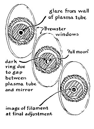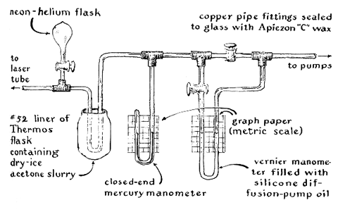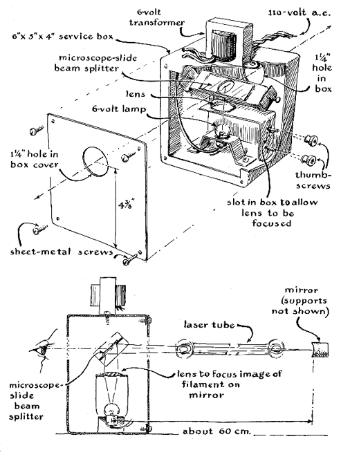 To install the Brewster windows clamp the tube in an apparatus stand or a comparable fixture, connect the sidearm tubing to the mechanical pump of the vacuum system and start the pump. Simultaneously place the cleaned Brewster windows flat against the cut ends. Suction will hold them in place. Using a toothpick as a spatula, apply a thin layer of Torr Seal epoxy cement to the exterior of the joint between the windows and the tube ends. (Torr Seal is manufactured by Varian Associates, Palo Alto, Calif.) Watch the inner surface of the windows carefully for any trace of vapor from the cement that may be sucked into the tube. If the least trace of vapor appears, the lapping job is defective and must be corrected. No cement should seep through the joint. The curing time of the cement can be shortened by applying heat to the joints by means of a pair of 150-watt incandescent lamps placed about 15 centimeters away. Recommended curing temperatures are specified on the package by the manufacturer. When the joints have cured, apply a coat of Dow Corning 306A silicone resin over the cement, all glass joints and the Dumet seals. Next fire up your vacuum system and connect the tube. The system should be equipped with at least two manometers: one a closed-end mercury type and the other a conventional manometer half-filled with high-grade oil of the kind used in a diffusion vacuum pump. Scales for the manometers can be made of graph paper calibrated in millimeters [Figure 6]. The oil manometer acts as a vernier gauge, the pressure readings in millimeters being converted to torrs by dividing the specific gravity of mercury (approximately 13.5) by the specific gravity of the oil and then dividing the difference in the height of the oil in the two arms of the manometer, in millimeters, by the quotient. For example, if the ratio of the specific gravity of the mercury to that of the oil is 16, a manometer reading of 32 millimeters-the difference in the height of the oil in the two arms- indicates a pressure of 32/16, or 2 torrs. You can find the specific gravity of the oil with sufficient accuracy by weighing 10 milliliters and dividing the weight (in grams) by 10. Your vacuum system should also contain a McLeod gauge, primarily for ensuring that the system pumps to the required 10-5 torr. If you do not own a vacuum system, you may be interested in building the inexpensive one described in the Scientific American Book of Projects for the Amateur Scientist (published by Simon and Schuster in 1960). My system uses a two-stage mercury jet pump. For valves the system has inexpensive glass stopcocks. I lapped them with 600-mesh grit to make a vacuum-tight fit and lubricated the stoppers with a thin film of high-vacuum grease. One stopper was modified to function as a leak valve for admitting the required minute volume of helium neon gas to the laser tube. Deep scratches about six millimeters long that tapered upward to the surface were cut counterclockwise from each end of the hole in the stopper. The tips of the scratches conduct gas at a convenient rate when they engage the openings of the barrel. You will receive the helium-neon gas in an all-glass container. The outlet tube contains an easily broken seal. To tap the supply clamp the flask temporarily to a support, with the tube pointing downward. Insert a loosely fitting glass marble or a short length of heavy glass rod in the tube, join the leak valve to the tube with Apiezon "C" wax and connect the valve to the vacuum system by 50 centimeters or so of copper capillary of the type used in the thermostats of gas stoves. Open the leak valve fully and exhaust the tube to 10-5 torr, or lower if possible. Then close the valve and invert the flask quickly so that the marble falls and breaks the tip of the $2 seal. The laser tube is next exhausted, cleaned by discharge bombardment, filled to the required pressure and sealed off. For support the tube can be assembled to the base, in which case the laser can be tested before the seal-off. Pump the tube down to 10-5 torr or lower, then backfill with helium-neon to a pressure of approximately 5 torrs. Connect and switch on the 9,000-volt transformer. The tube will fill with colored plasma-reds, greens, blues-and may get quite hot, on the order of 100 degrees centigrade or more. After five minutes switch off the power, repump the tube and repeat the cycle. Continue the procedure until the reddish color predominates, tinged only slightly by blue. This may require four but probably not more than six cycles. Before pumping down at the end of the last bombardment heat the getters to dull red. The tube should be positioned so that both getter assemblies are suspended vertically by their leads, otherwise they may sag enough to touch the glass when heat softens the metal. After about three minutes advance the Variac gradually to fire the getters. Watch the glass wall adjacent to the getter assembly as the temperature of the metal approaches yellow heat. A sooty film will appear. As the film reaches opaqueness switch off the power. Having pumped down, refill the tube to a pressure of not more than 2.7 torrs (assuming a plasma tube of two-millimeter bore). Energize the tube again. The plasma should now appear solid reddish-orange. When placed between a pair of properly adjusted mirrors, the tube will now function. To adjust the mirrors, first remove either of the cell fixtures from the base and replace it with the light projector. Adjust the lens of the projector until the image of the filament is in focus on the front surface of the distant mirror. Then, using your hand as a screen at the near end of the base, locate the beam reflected by the mirror and adjust the cell to center the beam on the distant end of the plasma tube. Look through the projector's beam splitter (the microscope slide) into the bore of the plasma tube; in the center of the glare that is reflected by the inner wall you may observe a minute disk of light th