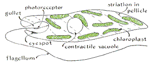 "Light," Baum writes, "is an immediate environmental factor in the life of most organisms. In the case of plants one thinks chiefly of photosynthesis, but the less overt processes of phototropism (plants turning toward light) and photoperiodism (the response of plants and animals to variations in the relative duration of day and night) are also controlled by light. The common denominator of these varied effects of light is the absorption of light energy in one or more photochemical, temperature-independent reactions and the conversion thereby of light energy into the energy of chemical bonds. "In the case of phototaxis, the entire organism moves in response to light. Positive phototaxis is exhibited by the flight of insects toward a light source at night and by such behavior patterns as the vertical layering of zooplankton in surface waters during the day. Negative phototaxis is exhibited by darkling beetles and their larvae burrowing under the oatmeal on which they are being cultured and by the myriad of arthropods living under a log or rock. "My interest in phototaxis was stimulated by the microscopic, single-celled organism called Euglena, which propels itself through water with a whiplike flagellum. Euglena has chloroplasts and can carry on photosynthesis, so that it qualifies in this respect as a plant. It also is capable of growing on appropriate media in the dark, so that it qualifies in this respect as an animal. Its high degree of motility, anterior gullet, contractile vacuoles, and its external, probably noncellulosic pellicle, or exoskeleton, are 'rule of thumb' animal characteristics [see Figure 1]. "It is likely that generations of biology teachers have plagued or stimulated their students by asking them if Euglena is a plant or an animal in the hope that they will perceive from this loaded question the arbitrary nature of biological classification at certain levels and the continuity of morphological and physiological features in various organisms The characteristics of Euglena combine to make it not only an interesting and instructive organism but also an excellent experimental subject.