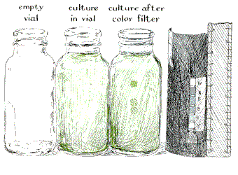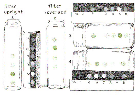 "The approximate intensity of the light passing through the color filters at the distances involved (and presumably reaching the organisms in the vial) was measured by a light meter. Meters of the type used for determining photographic exposures can be used. The clear filter transmitted the most intense beam, followed by blue, then yellow, green and red in order of decreasing intensity. The approximate corresponding range of wavelengths was determined by measuring sample strips of the colored plastic in a colorimeter that indicated the percentage of light transmitted. The light turned out to be far from monochromatic. For example, the blue plastic transmitted blue light as follows: at a colorimeter setting of 400 to 450 millimicrons (blue), 90 percent; at 550 millimicrons (green), 60 percent; at 650 millimicrons (red), 23 percent. For a given range of wavelengths the intensity was varied by using two or more thicknesses of the filtering material. Complete data on the light-transmission characteristics of the plastic material are usually available from the manufacturer. "Active Euglena cultures moved to the colored windows in less than 15 minutes. White light produced the quickest response, followed by blue, green, yellow and red. The number of organisms that assembled at each window was also greatest in the case of white light and declined in the same sequence: blue after white, then green, yellow and red. The sequence was the same whether the culture was lighted for only a few hours or overnight. The maximum phototactic response in blue light coincides with the maximum absorption of blue light by the eyespot. If aggregation of the organisms is allowed to continue for periods of more than 30 minutes, the Euglena adhere to the walls of the glass vials even when the culture is mildly agitated. The cultures can then be carefully poured off and the vials inverted on a paper towel for drying. After drying, the Euglena aggregates can be fixed to the glass by placing the vial next to a low heat source for a few minutes. "A more versatile color filter was next constructed in which different-colored plastic strips 5/8 inch wide were placed across rectangular slots, measuring about two inches by 1/4 inch, cut in a black paper cylinder. The strips were arranged horizontally and overlapped about 1/16 inch. They were held in place by strips of gummed paper placed along the overlapped edges. Still a third variation of the filter assembly was prepared by securing narrow strips of colored plastic across a wide slot (about 1/4 inches) cut in a three-by-five-inch card. This proved to be a very flexible device, easy to place over slots in opaque sleeves that fit a variety of containers in assorted shapes and sizes.