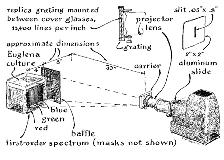 "The results of experiments made with the color filters were so encouraging that I decided to subject cultures to an actual spectrum in the hope of observing the sharpest possible differentiation of phototactic response with respect to the wavelength of light. A simple apparatus for dispersing the light was improvised from materials that were at hand. The rays of a 60-watt incandescent lamp were refracted into a beam of parallel rays by means of the lens from a reading glass and were dispersed into the spectral colors by a glass prism that measured 1 1/2 inches by two inches. The colors were then projected onto a culture of Euglena. A pronounced differential response was immediately apparent. Maximum aggregation occurred in the red area of the culture! This was contrary both to the results previously observed and to the literature. The puzzle was resolved by measuring intensity across the spectrum: the light meter indicated that the red portion was almost 20 times more intense than the blue. The difference in energy was therefore masking the effects of the difference in wavelength." (If the amateur does not own a prism, an alternate source of intense spectral light can be improvised by equipping an ordinary 35-millimeter projector with a vertical slit in the position normally occupied by the slide and placing a replica diffraction grating in front of the projection lens. This scheme is suggested by Roger Hayward, who illustrates this department. Transmission gratings of adequate quality for this application can be obtained for $1.50, in a sheet that measures eight by 11 inches, from the Edmund Scientific Co. in Barrington, N.J. Details of the arrangement are depicted in Figure 4.)