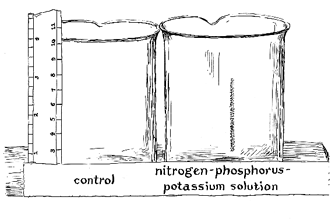 "On one occasion, when a very dense, older culture of Euglena was exposed to light overnight, I was surprised to find no phototactic response. Although apparently all experimental conditions were in order, the organisms failed to aggregate and to adhere to the side of the vessel. This and related evidence suggested that not all cultures are phototactically equivalent. Therefore care should be taken in the design of experiments to equate only the results of cultures that are comparable in terms of age, nutrition and similar factors. "Since there is some indication that the inorganic environment may influence phototaxis (and other processes as well) I decided to investigate whether or not this might be a factor in the lack of response of the inactive cultures. The inactive organisms were older, denser cultures in which the pea extract I used as a nutrient in the medium had not been replenished for several weeks. In lieu of waiting for a culture to become nutritionally depleted one could separate the organisms from the culture solution by aggregating active Euglena on the sides of a vessel and either pouring off the balance of the culture, centrifuging or filtering. The aggregated organisms could then be resuspended in tap water or distilled water. "To investigate the effect of mineral nutrition I dissolved a commercial N-P-K (nitrogen-phosphorus-potassium) plant-fertilizer tablet in water an added the equivalent of half a tablet t a 400-milliliter suspension of photo tactically inactive Euglena. I kept an other suspension without fertilizer as control. Essentially no phototaxis an aggregation were observed in the control, but the experimental culture to which the plant tablet had been added displayed marked activity [see Figure 5]. This suggests that mineral nutrients may be a decided factor in phototaxis. "In another experiment made to disclose the effect of mineral salts on inactive organisms, nitrogen, phosphorus and potassium were added to separate phototactically inactive cultures in amounts equivalent to their concentration in the plant-fertilizer tablet. To each 100 milliliters of cultures of inactive Euglena I added 15 milligrams of phosphoric acid, 16 milligrams of potassium chloride and 190 milligrams of ammonium sulfate. Light intensity was maintained at 400 foot-candles. The light source was placed 20 centimeters from the cultures. The light exposure was five hours. The salts most effective in promoting phototaxis and aggregation were, in descending order, phosphorus, nitrogen and potassium. All produced more aggregation and phototaxis than appeared in the control. These results indicate not only the general effect of mineral nutrients on phototactic response but also the differential effects of the several ions, particularly the pronounced influence of phosphorus and nitrogen. "Sets of inorganic 'sufficient-and-deficient' plant-growth salts are available from biological supply houses. The results of experiments made with them not only are readily apparent to the eye but also are automatically plotted by the differential adhesion of the organisms to the glass. Permanent records of the responses can be made by simply photographing the aggregated organisms. The same general procedure can be used for investigating the effect on phototaxis of light intensity, pH, drugs, vitamins, hormones and age of cultures. "Active Euglena organisms as well as many other cultures are stocked by the larger biological supply houses. Pure cultures of both green and colorless species of Euglena for research uses are available from the Culture Collection of Algae at Indiana University. Algae and other organisms can also be collected in the field. The specimens are placed in an aquarium, concentrated phototactically by a light source placed at one end of the aquarium in an otherwise darkened room and pipetted into a simple culture medium. Alternatively, the organisms can be placed in a volumetric flask that is darkened except at the neck; after they have aggregated they can be pipetted out of the neck. "Two nutrient media are widely used for culturing Euglena. The split-pea medium is made up of the fluid obtained by boiling 40 split-pea halves in one liter of tap or pond water for a few minutes and then discarding the solid residue. The second medium, known as the soil-water type, is also highly recommended for Euglena as well as for a wide variety of other algae. It is prepared by adding successively to a test tube a pinch of calcium sulfate, a half-inch of good garden soil and a quarter of a dried split pea. About 75 milliliters of water (tap, pond or distilled) is then added along the side wall of the test tube. After the test tube has been loosely plugged with cotton it is steamed (do not autoclave) for one hour on each of two successive days. After the resulting fluid has cooled and cleared by settling it can be inoculated with the desired organisms. "I have used split-pea medium with consistently satisfactory results. One may observe a temporary rapid increase in bacteria after adding split-pea medium to a culture. The bacteria will diminish over a period of several days as the concentration of the Euglena in creases until they are no longer apparent. "The experiments need not be confined to Euglena. Although most species of Paramecium will be found to be indifferent to moderate light intensities, P. bursaria, which plays host to enough green algae to give it a green and plantcell-like appearance, is positively phototactic. In these organisms phototaxis has been found to be a response related to the oxygen produced by the symbiotic algae in photosynthesis. It is sometimes referred to as secondary phototaxis arising from chemotaxis or aerotaxis. I once observed the response by placing a culture of P. bursaria in a miniature beaker that was completely darkened except for a single 1/4-inch hole punched in the black paper on the bottom. The culture was placed on the stage of a stereoscopic binocular 