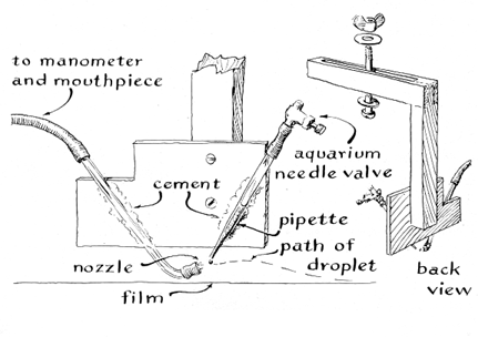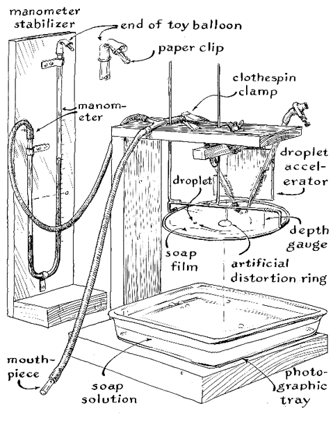 "To find the approximate shape of the film when it was loaded by a droplet I first centered the droplet in the ring by adjusting the wedges to level the stand and then measured the film shape as before. A graph of these measurements resembled the inverse-square, funnel-shaped curve used in the solid simulators. Attempts to measure shape 11 when the film was loaded with two drops failed. One drop or the other would fall off, so I settled for synthetic loading. I achieved that by attaching to the crossarm a small ring of the same wire used for the distortion gauge. The ring could be placed in contact with the top side of the film at any desired position on the vertical axis and would thus distort the film any desired amount. "The weight of a droplet was measured by determining the number of drops required to make a gram of liquid. The medicine dropper I used released drops of about .024 gram. I measured the surface tension of the soap h solution by using a balanced rod and finding the force required to lift it clear of the solution. The method indicated a surface tension of .03 gram per centimeter, about half that of pure water. "After making these static measurements I began experimenting with the orbits of drops and with tidal effects. To investigate the velocity of the drops I needed an accelerator for shooting drops onto the film at controlled speed and direction. My first two attempts to make an accelerator-one with a pendulum and one with a film placed at an angle to the main film-were unsatisfactory. "The final model consists of a pipette that injects a drop into a jet of air that acts as the accelerator. It works beautifully. The air jet is formed by a glass nozzle that makes approximately a right angle with the glass tubing from which it was formed. The diameter of the nozzle is about three millimeters. An adjustable rubber sleeve near the opening of the nozzle helps to preserve the streamline flow of the jet. A rubber tube connects the nozzle to a glass Y joint. A clothespin on the rubber tube serves as a pinch clamp for regulating the flow of air. From one arm of the joint a rubber tube is connected to a mouthpiece; the tube from the other goes to a water manometer. Oscillations of the water column in the manometer are suppressed by a check valve. The valve consists of the neck of a toy balloon and a paper clip. One end of the rubber tube is slipped over the open arm of the manometer and the free end of the tube is weighted by the paper clip. "When the clothespin and the rubber sleeve of the nozzle are properly adjusted, droplets released by the pipette can be accelerated smoothly. A needle valve-at the top of the pipette controls the rate at which drops are released [see illustration below]. "To calibrate the accelerator I placed the nozzle 19.6 centimeters above the soap solution. That is the distance at which drops require .2 second to fall to the pan. The horizontal distance traveled by the drop at various pressures, as indicated by the manometer, was then measured. By multiplying the horizontal distance by 5 I found the velocity of the drops in centimeters per second. Velocity was then plotted against the manometer pressure. By referring to the graph I could launch a drop onto the film at any desired velocity. "Having calibrated the apparatus, I observed the orbit of a drop around a stationary body by launching a drop around the distorting ring. After several elliptical orbits the drop spiraled in to collide with the ring, simulating the orbital decay of a satellite around a massive body.