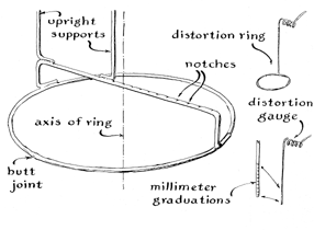 "To measure these phenomena I made another apparatus that consisted of a ring assembly to hold the film, a stand, a pan of soap solution and some leveling wedges [see top illustration]. With this apparatus I measured the static properties of the film, such as its shape, rate of evaporation and surface tension. "For the ring I used about B0 centimeters of three-millimeter copper-coated steel welding rod bent into circular form 20 centimeters in diameter. The ring should be reasonably circular, but it does not have to be perfect. (A substitute material for the ring, if one is desired, should be nonporous and at least three millimeters thick, otherwise it will not hold a film long enough for experiments.) "The ends of the wire ring were soldered together in the form of a butt joint. A supporting crossarm was made from a 30-centimeter piece of the same kind of rod. This stiffened the ring and also served as a base line for measuring the shape of the fi]m. The ends of the crossarm were bent down. It right angles to make brackets about three centimeters long and were soldered to the ring. This arrangement provided a convenient space between the crossarm and the fi]m. The ends of the crossarm were attached to the ring at points remote from the butt joint so that the joint would not be damaged by the heat of subsequent soldering. Half of the crossarm was calibrated for length by a series of file notches at one-centimeter intervals from the center of the ring [see above].