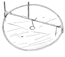 "To attach the ring and crossarm to the stand I soldered two 25-centimeter rods vertically to the unmarked side of the crossarm, one at the edge and the other about two centimeters from the center point. The ring assembly was painted black and the file marks white. The vertical rods were pushed into close-fitting holes drilled in a wooden stand shaped like a C:. The stand rested on three wedges. The pan of soap solution was placed on the base. "My soap solution consisted of one part of Liquid Lux detergent and 19 parts of tap water. Other detergents tended to produce a viscous area in the center of the films that impeded the free travel of the droplets. The pan was placed about 20 centimeters below the ring and the solution was some three centimeters deep. "To make a film the pan is gent]y raised until the ring is immersed, then slowly lowered until the film separates from the solution. I found that if the crossarm was immersed in the solution, a second film would form that distorted the main film. When the crossarm is not immersed, the single film will last about three minutes in still air.