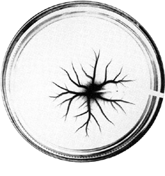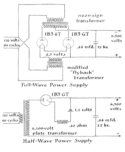 "Another interesting phenomenon is the simulation of the formation of a star or a planet. This is demonstrated by spraying fine droplets of solution onto a fresh film with a toothbrush and letting them coalesce into a drop; the spray represents the interstellar gas cloud and the drop the star. "The apparatus can doubtless be modified for demonstrating still other interesting effects. For example, a curved universe could be simulated by using a saddle-shaped ring for negative curvature or by deflecting the film by an upward current of air to form a positive curvature. Another possibility is to show the effects of gravity on light by vibrating the film and allowing the waves to travel through the droplets. I have not had time so far to explore fully all the potentialities of the model. The experiments that have been made, however, certainly support an observation once made by the British physicist C. V. Boys: 'There is more in a common soap bubble than those who have only played with them generally imagine.'" While experimenting with Leyden jars in 1777 the German physicist Georg Christoph Lichtenberg observed that an electric discharge between a pointed electrode and a conductive plate covered with fine powder would scatter the powder into strange and beautiful patterns that differed characteristically, depending on the polarity of the point and the conductive plate. The patterns subsequently became known as Lichtenberg figures. Elric W. Saaski of Iron River, Wis., has built a modern apparatus for investigating the figures and recording them by color photography. The apparatus shows the phenomenon in greater detail than Lichtenberg's. "My apparatus," writes Saaski, "resembles the Klydonograph more than it does the arrangement used by Lichtenberg. Essentially the Klydonograph consists of a photographic emulsion sandwiched between two electrodes: a small brass disk that rests on a somewhat larger one. The small disk is connected to the power line; the larger one, to the ground. I substituted a water surface for Lichtenberg's powder and for the photographic emulsion of the Klydonograph. The fluidity of the medium and its ability to hold ions in solution are convenient for controlled experimentation. When I made the accompanying photographs, I connected one side of the capacitor to a metal pan 12 centimeters in diameter; the pan contained water to a depth of one centimeter. Then I moved a pointed discharge electrode, which was connected to the other terminal of the capacitor, toward the water until a spark jumped, discharging the capacitor and creating the Lichtenberg figure on the surface. "To produce the direct-current surges for my experiments I used a power supply that consisted of a transformer, a rectifier and a capacitor. The high potential is derived from a 9,000-volt, center-tapped neon-sign transformer that supplies a constant current of 18 milliamperes. This output is converted to direct current by a pair of 1B3 GT high-voltage diodes in a full-wave rectifier circuit. The rectifier was built on a plastic sheet six inches wide and eight inches long, supported on six half-inch porcelain legs. The full-wave circuit was of conventional design, with the current for the filaments supplied by a "flyback" transformer I had rebuilt to function as a step-down transformer on 110 volts a.c. The rectifier does not have to be this elaborate, however. One 1B3 GT tube can be used in a halfwave circuit, with the current supplied by a common 'D' cell if necessary [see illustration below]. The maximum output of the full-wave rectifier is 40 milliamperes at 6,300 volts (peak voltage). I was somewhat apprehensive about the ability of the 1B3 GT tubes to take the current surges as the capacitor was charged because the tubes are designed for a maximum load of one milliampere, but my fears proved groundless. "The rectified current is stored in a capacitor, the modern counterpart of Lichtenberg's Leyden jar. In principle a capacitor is merely two conducting plates separated by some type of insulator. When the two plates are connected to a source of direct current, an excess of electrons accumulates on one plate, with a corresponding deficiency on the other. The charging voltage must not exceed the dielectric strength of the insulating material between the conductors or the insulator will be punctured. "When the charged capacitor is disconnected from the source of current and a circuit is completed from one plate to the other, electrons flow until the difference in potential is equalized. By stacking a number of insulated plates and connecting alternate plates it is possible to increase the capacity of the unit to store energy. Capacitors of the size needed for this experiment are priced at $100 and up, depending on the construction. I made one for less than $10. The unit consists of 30 five-inch-square sheets of aluminum foil sandwiched between 79 six-inch-square sheets of Mylar plastic film .003 inch thick. Mylar film has a breakdown strength of approximately 4,000 volts per thousandth of an inch thickness. Unfortunately the dielectric strength of substances does not increase in direct proportion to thickness. My capacitor operates at six kilovolts. For safety's sake I use Mylar film .003 inch thick, rated at 12 kilovolts breakdown. Polyethylene plastic can also be employed. The rated breakdown voltage of this material, however, is only one kilovolt per thousandth of an inch thickness. Both plastics can be ordered through most hardware stores and mail-order houses in the forms used for protecting machinery from the weather. "Since aluminum generally cannot be bonded to other metals, I found it best to cut each capacitor plate and its external lead from a single piece of foil. Plates cut five inches square with a lead one inch wide and five inches long utilize the 12-inch width of a roll of aluminum foil without waste. Alternatively plates can be cut 10 inches on a side with a lead two inches wide. This sa