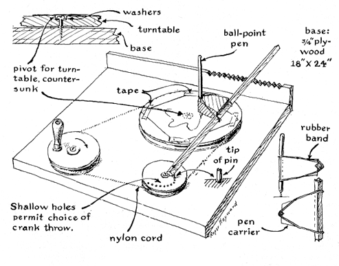 "In general, mechanical harmonographs use either pendulums or cranks for oscillators. The movement of a horizontal crank when viewed from the side is the same as that of a pendulum when viewed from the bottom. Both are examples of harmonic motion Pendulum machines are easier to construct and have the added charm of generating figures that diminish in size as the amplitude of the swing dies away. "One simple version of the pendulum machine consists of a flashlight suspended upside down by a slender wire. The bulb is masked so that light emerges through an aperture the size of a pinhole. When the flashlight is made to swing in an ellipse and is photographed from the bottom by time exposure in a darkened room, the light pattern takes the form of a spiraling ellipse. The axis of the ellipse rotates because of unavoidable irregularities in the suspension of the flashlight. "A more sophisticated pendulum machine that generates figures like those made by Lissajous is credited to the British physicist Hugh Blackburn. This pendulum is made by hanging a weight from two slender wires of equal length attached a short distance apart to the bar or beam used for suspension. At a selected point the wires are bound together by a snugly fitting ring; they then form a single strand that can be lengthened or shortened by sliding the ring up or down. Pendulums of this type, often exhibited at science museums, are equipped with a bob in the form of a conical- cup that has a small hole in the bottom for releasing a trail of sand that records the motion. "A simple version of a machine of the crank type is easily constructed of wood. One made recently by Tom 13arnard of Tucson, Ariz., rests on a board about 3/4 inch thick and 18 by 24 inches in its other dimensions. The board supports three pulleys linked together by a common belt [see Figure 1]. The upper side of the largest pulley, which is about 10 inches in diameter, serves as a turntable for rotating a sheet of paper taped in place. An adjustable crank arm that carries the pen is driven by a smaller pulley. The machine makes its most interesting designs when the diameter of this pulley is not a multiple of the diameter of the largest pulley. The crank arm engages any one of a series of radially spaced holes in the driving pulley. This scheme enables the operator to increase or decrease the throw of the crank as he wishes. The distant end of the arm slides on a notched board at the rear of the machine; the particular notch in which the arm is placed determines the radius of the harmonogram. A conventional ball-point pen is attached to the arm by a sheet metal bracket and a rubber band. A third pulley, turned by hand, powers the device.