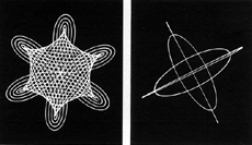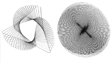 "All machines except the simple pendulum types can be made to generate stereoscopic harmonograms, which are patterns that appear in three dimensions when viewed through a stereoscope or with the aid of a prism. With practice some people find it possible to see the patterns in three dimensions by crossing their eyes in such a way that the left eye views only the right figure and the right eye only the left one. To make stereoscopic pairs with a double-pendulum machine, such as the one shown in the upper illustration in Figure 4, the pendulums are first released simultaneously. When the resulting figure is finished, its stereoscopic mate is made by releasing one pendulum slightly before the other; thus it has a head start of about five degrees of swing. The resulting figures are then photographically reduced in size so that they do not overlap when they are mounted side by side at a center-to-center distance of 25 inches. When mounted, the figures must be oriented so that they would be in register if they were displaced and superposed. Stereoscopic harmonograms can be made by machines of the gear type merely by increasing the radius of the pen arm about 5 percent when generating the second figure.