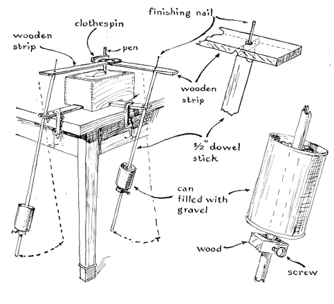 "A rather more sophisticated but less portable machine is the twin-pendulum harmonograph [see illustration on the left]. Two pendulums, linked independently to the pen, swing at right angles to each other. A small table supports the paper in contact with the pen. The rate of vibration of each pendulum can be separately adjusted by raising or lowering the appropriate bob. We made our pendulums of 1/2-inch wooden dowel rods a yard long. The rods pivot on knife-edges about 10 inches from the top end. The bobs are tin cans containing approximately six pounds of gravel. "We found that the pen writes most reliably when it is weighted with two ounces of iron washers. This arrangement results in figures with rather widely spaced lines because the drag of the pen slows the machine quickly. Patterns of closely spaced lines were made by substituting a Leroy lettering pen for the ball-point pen. The Leroy pen exerts only a few grams of pressure. We enlarged its ink capacity by pushing the upper part of the pen into a 1/2-inch length of tubing with an inside diameter of 3/16 inch. We used the No. 0 and No. 1 pen sizes.