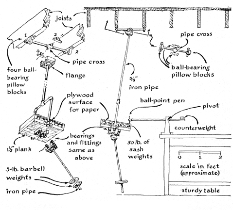 "Our most recent machine is a version of the elegantly simple double-elliptic pendulum first described in 1907 by British experimenters. It consists of a small wooden platform weighted with 50 pounds of iron [see lower illustration at left]. The platform is suspended through a yoke and a length of iron pipe by ball-bearing gimbals fixed to the ceiling. The figure is drawn on paper that is taped to the platform; the drawing instrument is a pen attached to one end of a counterweighted lever arm. This simple arrangement generates only circles, ellipses and straight lines. The interest of these figures can be enhanced by making identical drawings and superposing one on the other with a slight displacement; moiré patterns then appear. "The most astonishing increase in the versatility of the machine can be made, however, by suspending a second, less massive pendulum from
